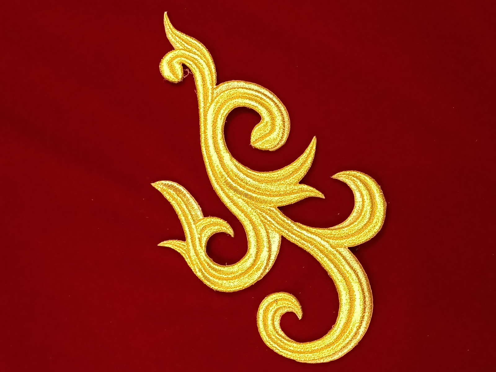 - Aplicación bordada en hilo de oro metaloplastico con diseño floral en forma de llama con ondas de gran calidad con terminaciones en forma de hojas. Artículo muy utilizado para lo confección de prendas de Semana Santa.