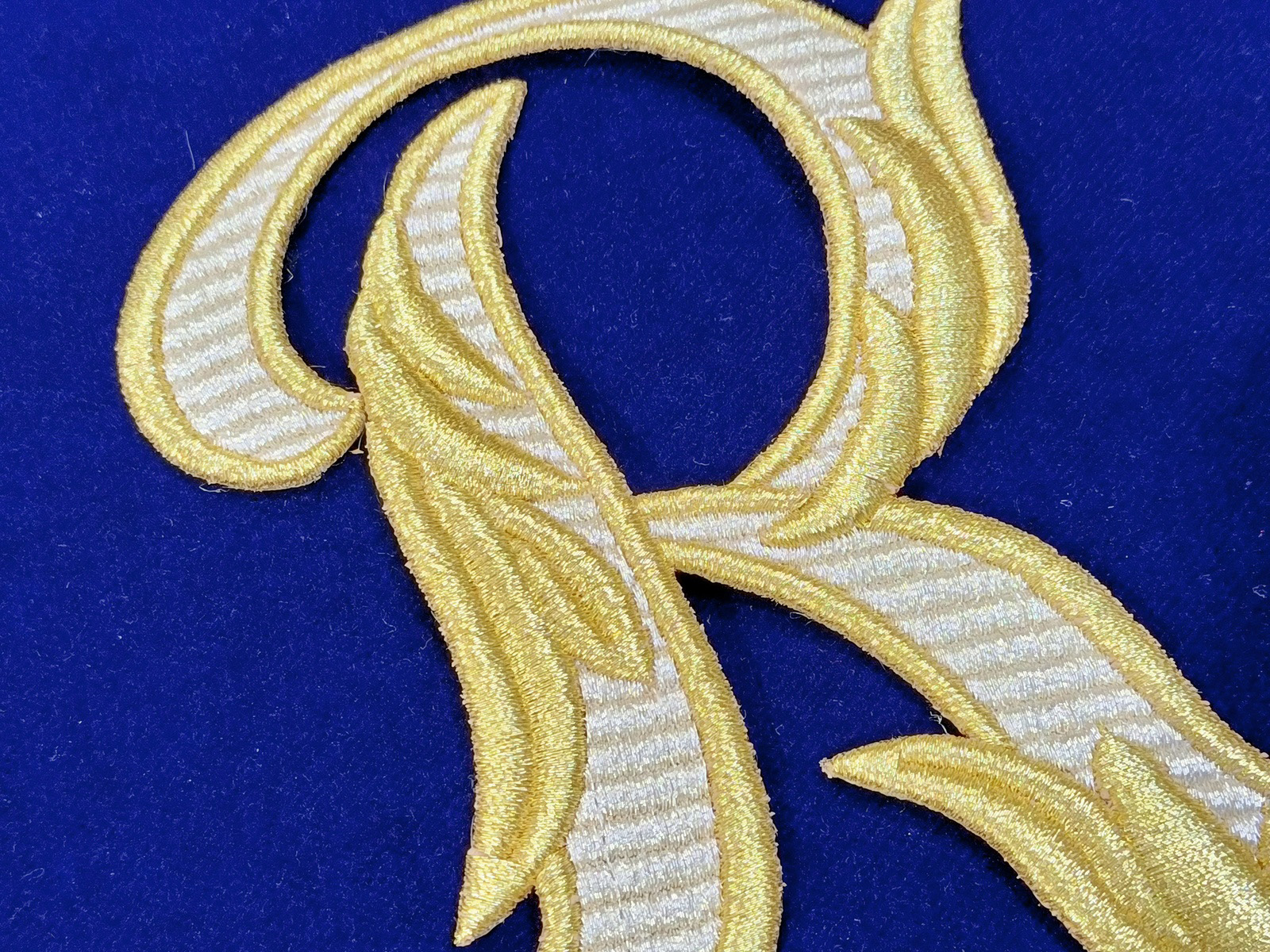 Aplicación bordada en hilo de oro doble metaloplastico con diseño en la letra "R" con cantos bordados y relieve a dos tonos de color..Artículo muy utilizado para lo confección de prendas de Semana Santa.