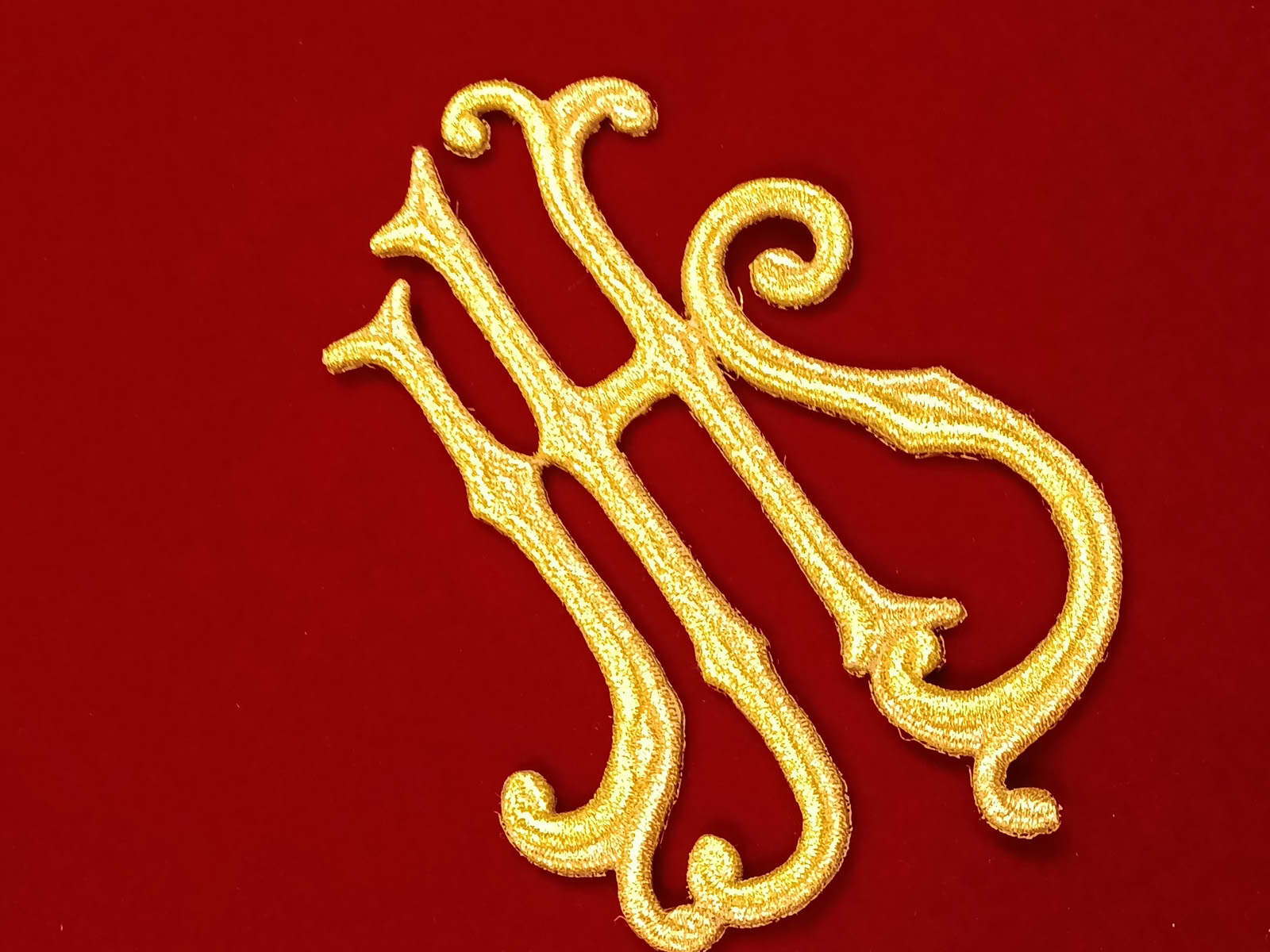 - Aplicación bordada en hilo de oro metaloplastico con diseño en "JHS" con bordado en relieve. Artículo muy utilizado para lo confección de prendas de Semana Santa.