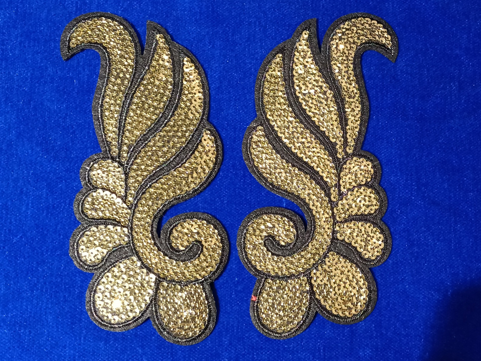 Aplicaciones de fantasía compuestas en su mayoría de lentejuelas sobre una base de termoadhesivo con foma de hojas tanto para terminación de cuellos de fantasía como para piezas sueltas.El lote esta compuesta de una pieza izquierda y una derecha.