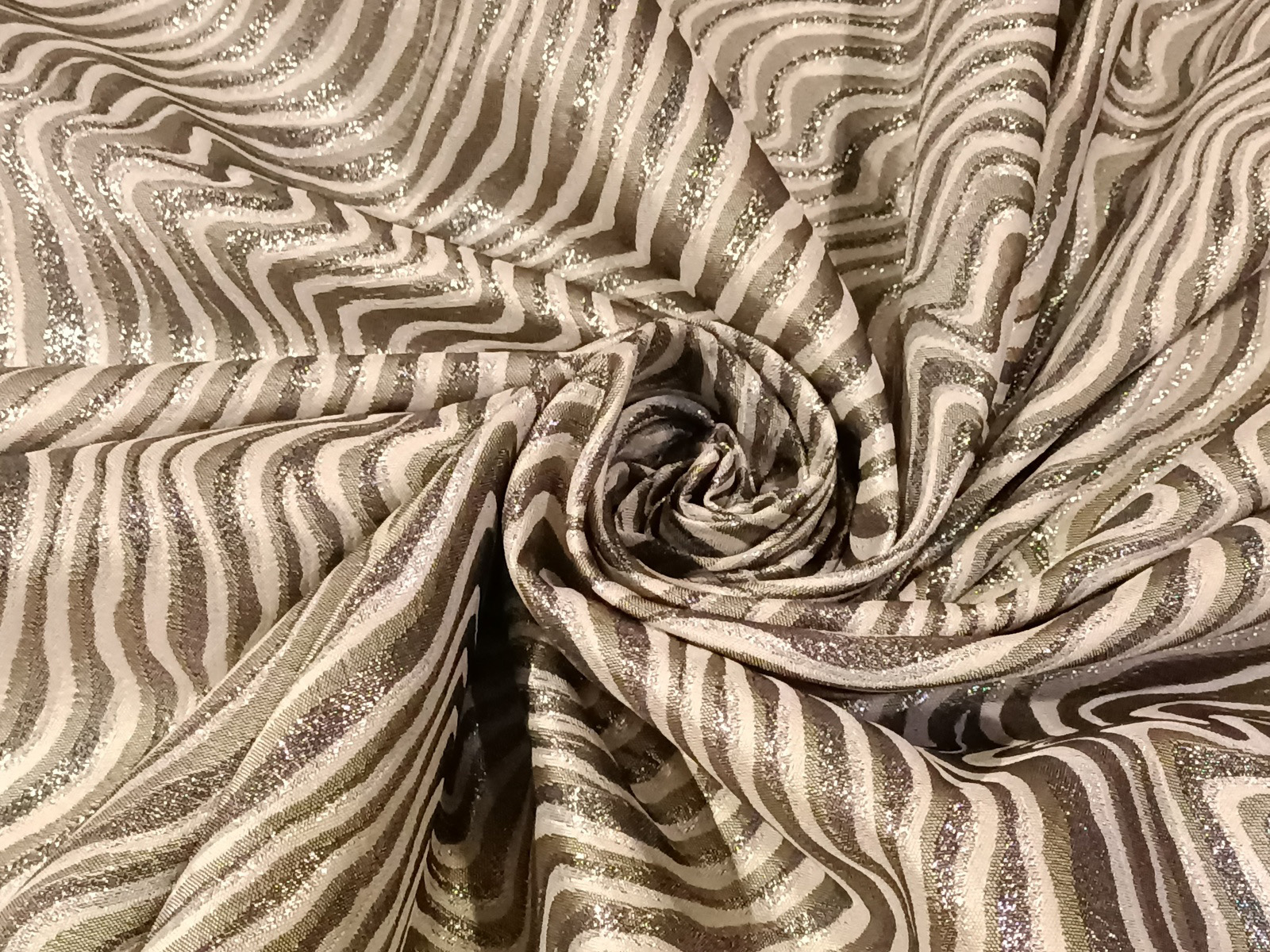 Brocado de lame en poliester plata y fondo blanco con diseño ondulado de una gran textura y brillo .