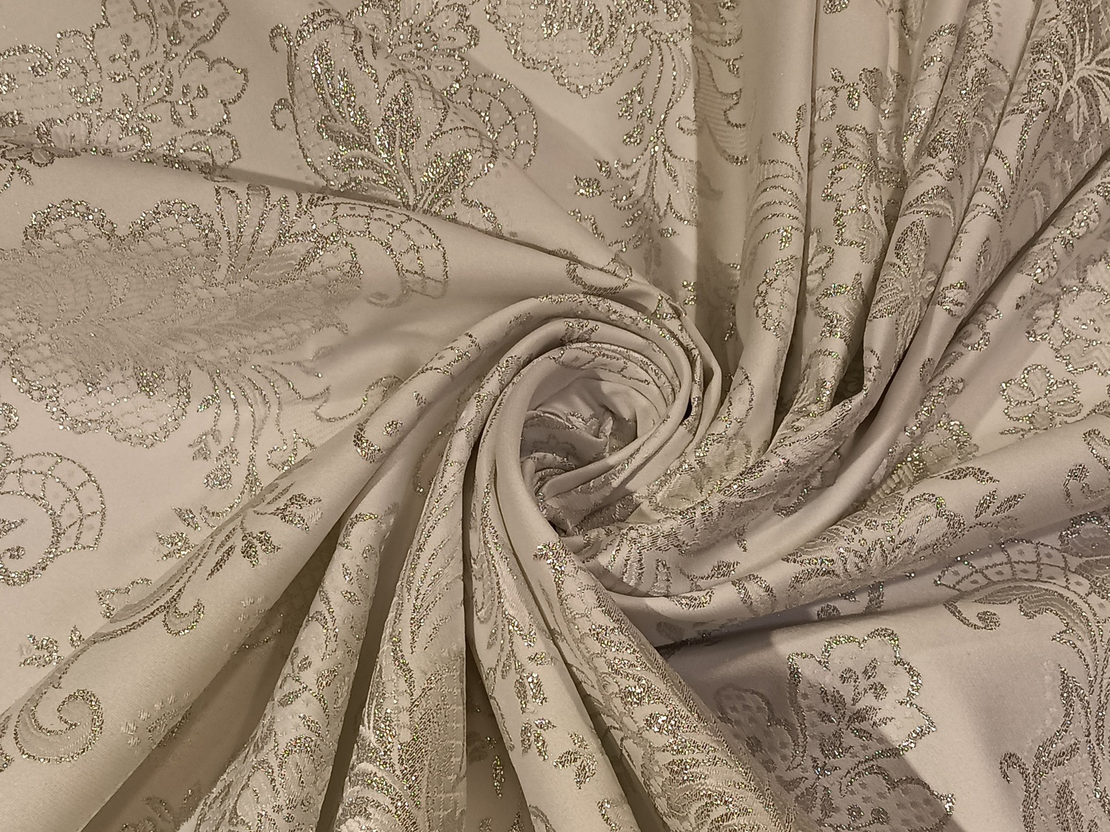 Tejido de Brocado en poliester con dibujo de rameado floral pequeño en lúrex en color plata. Tiene un ancho de 280 cms.Es un tejido preparado para confecciones de gran tamaño, tanto por el dibujo como por el ancho del tejido.