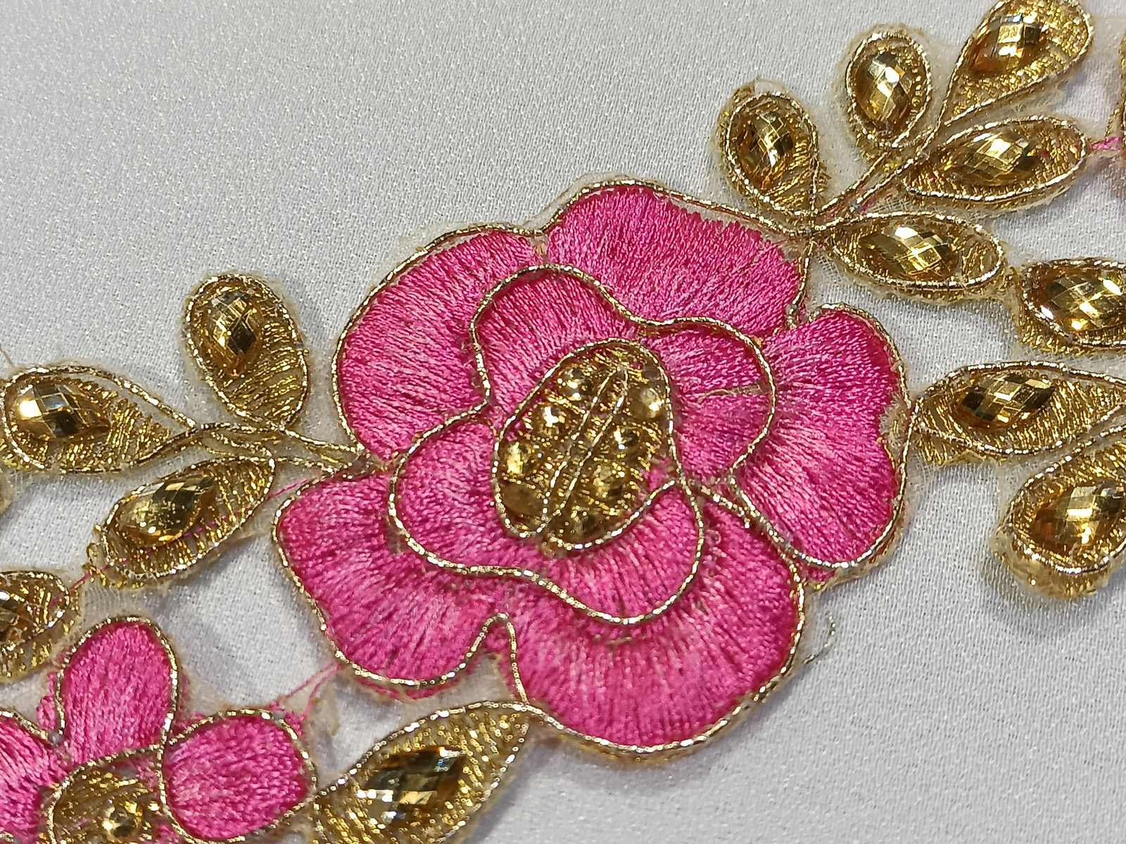 Cenefa Bordada en rosa con diseño en flor canteado en cordoncillo oro con detalles en hojas con bordado en hilo efecto oro metálico y en piedras al mismo tono en oro.Posibilidad de recortar las piezas por separado.Cenefa de una gran calidad de bordado y con detalles de brillo en piedras.Este tipo de artículo es adecuado para la terminación de trajes de fiesta, ceremonias,detalles de tocados y complementos.