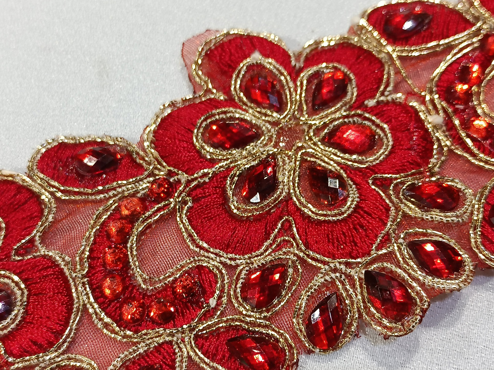 Cenefa Bordada con diseño en flor canteado en cordoncillo rematando los bordes en oro con detalles en piedras al mismo tono.Cenefa de una gran calidad de bordado y con detalles de brillo en piedras.Este tipo de artículo es adecuado para la terminación de trajes de fiesta, ceremonias,detalles de tocados y complementos.