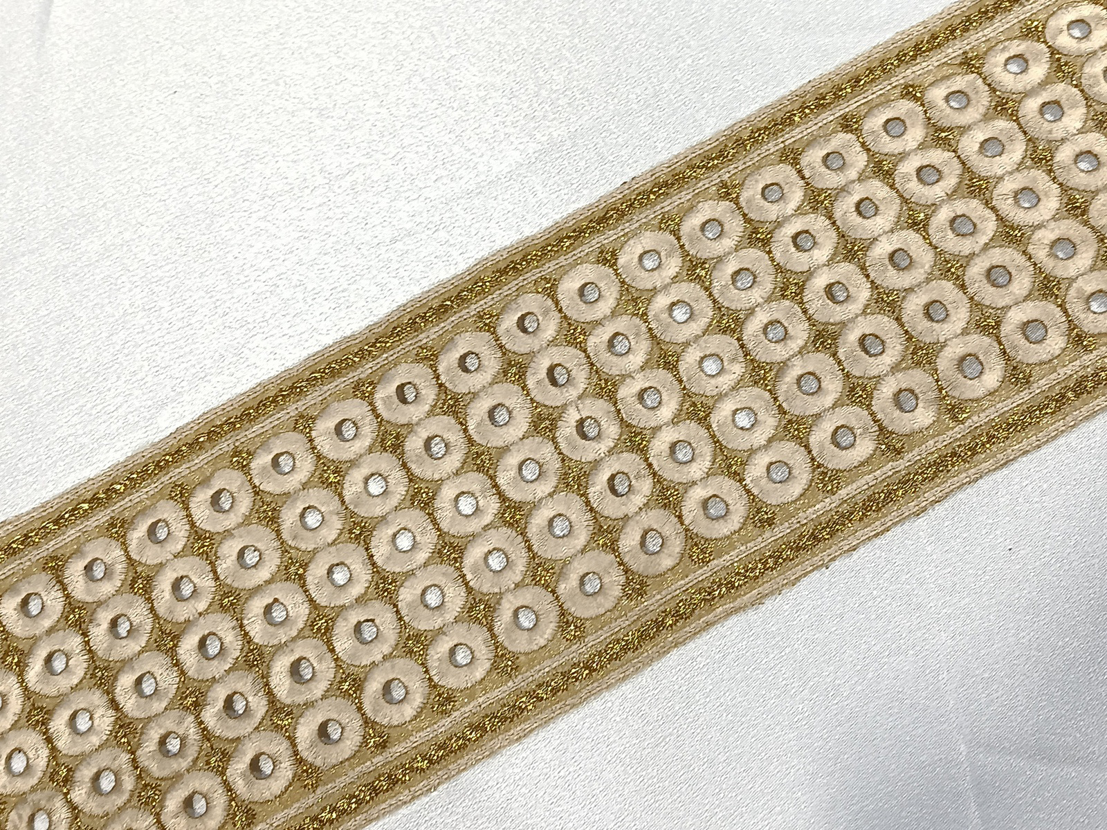 - Cenefa bordada en fondo camel con bordado en circulos calados con detalles lineales en oro efecto metálico suave . Es un tipo de artículo llamativo de muy buen acabado para tejidos de ceremonia, complementos de prendas y toques llamativos.