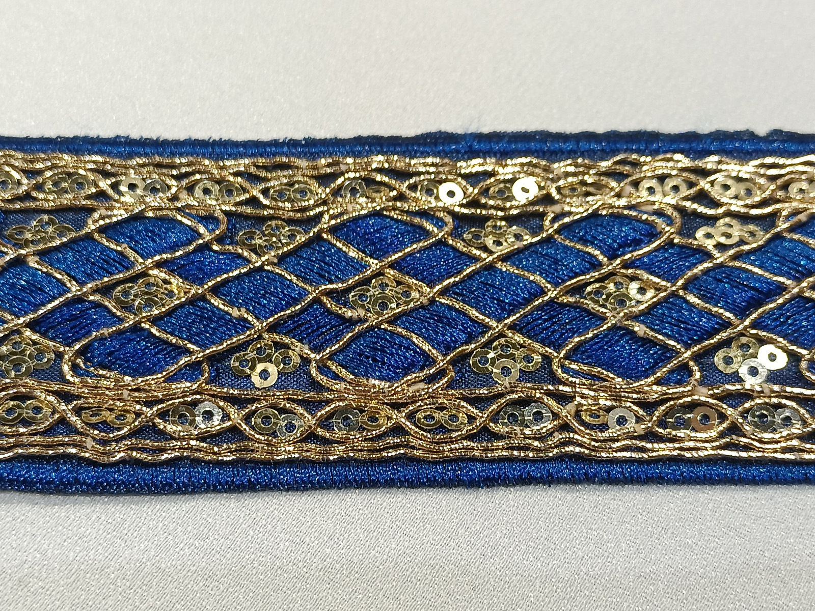 - Cenefa enrejillada de fondo azulón con cordoncillo en oro efecto metálico con detalles en lentejuela pequeña bordado en tono oro brillo por todo el diseño.Cenefa con una muy buena calidad de bordado para terminaciones y complementos de prendas de vestir.