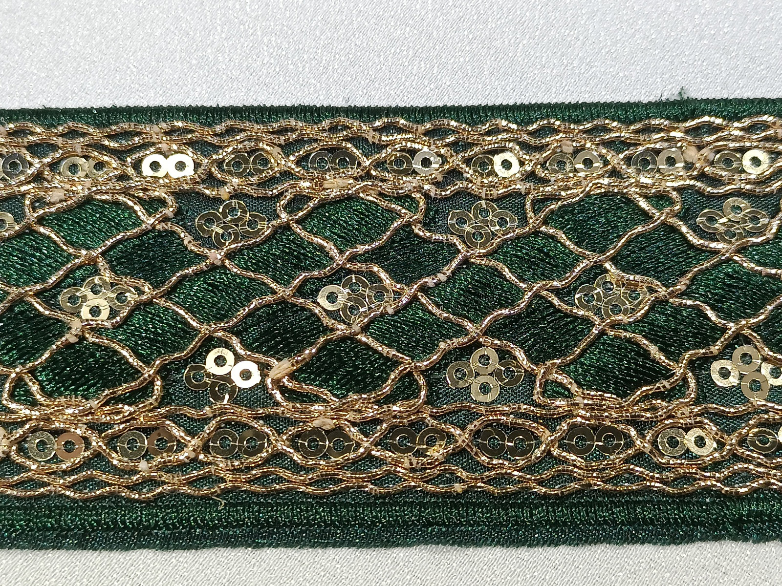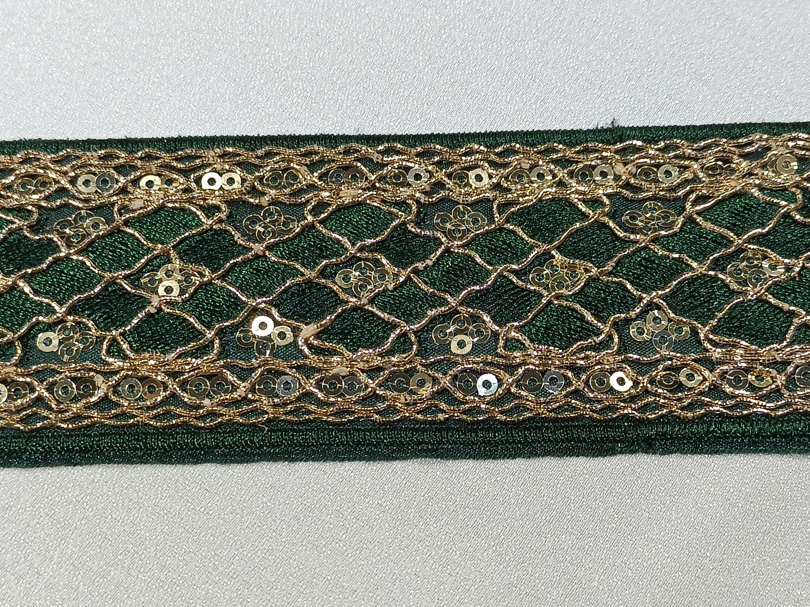 - Cenefa enrejillada de fondo verde con cordoncillo en oro efecto metálico con detalles en lentejuela pequeña bordado en tono oro brillo por todo el diseño.Cenefa con una muy buena calidad de bordado para terminaciones y complementos de prendas de vestir.