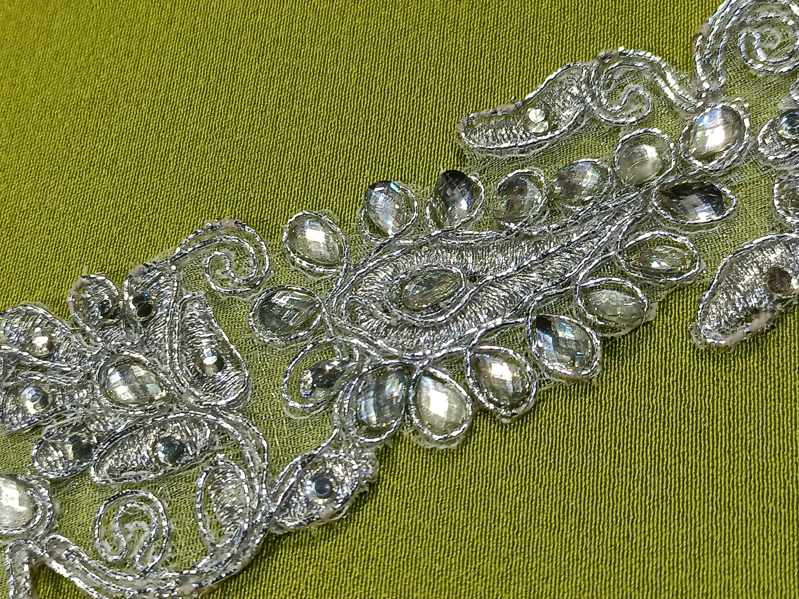 Cenefa bordada de tipo fantasía sobre organza de cristal combinando diseño de hojas y diseños de cachemire con pedrería en tonos cristal y cordoncillo plata efecto metálico canteando el bordado.