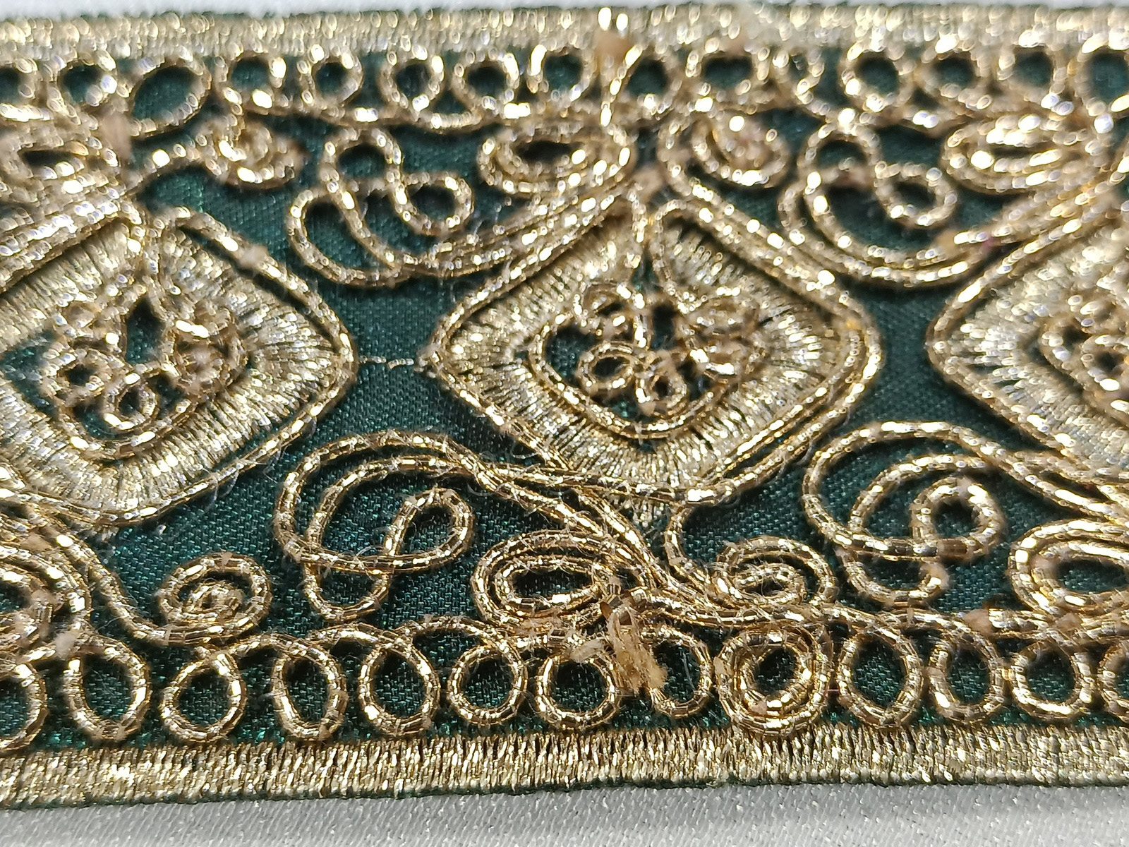 Cenefa bordada en hilo de oro y cordoncillo de oro con fondo en tono verde con un acabado excelente.Cenefa con una muy buena calidad de bordado para terminaciones y complementos de prendas de vestir.
