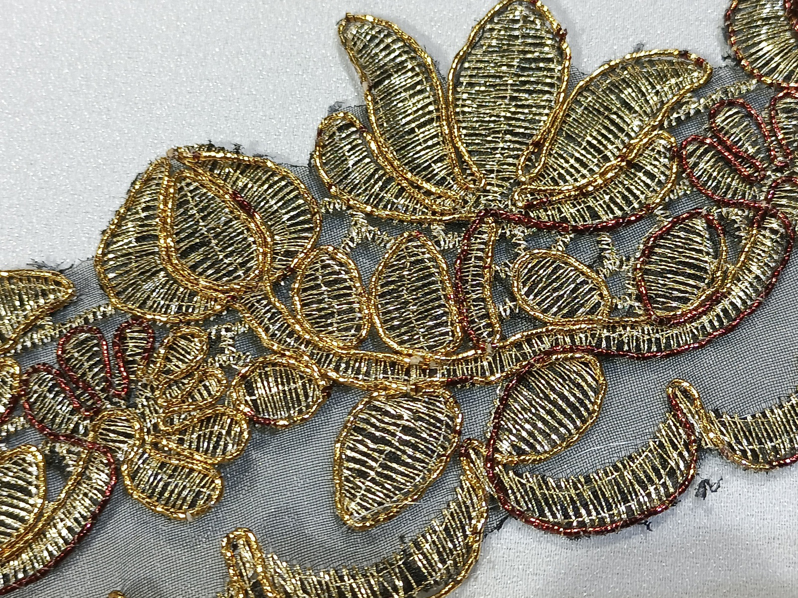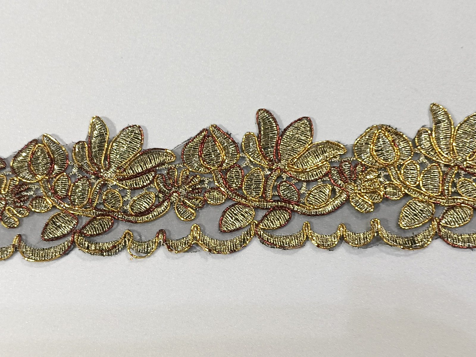 Cenefa bordada con diseño floral en color Marrón canteado y perfilado con cordón en oro con un bordado de gran calidad.Es un tipo de artículo llamativo de muy buen acabado para tejidos de ceremonia, complementos de prendas y toques llamativos.