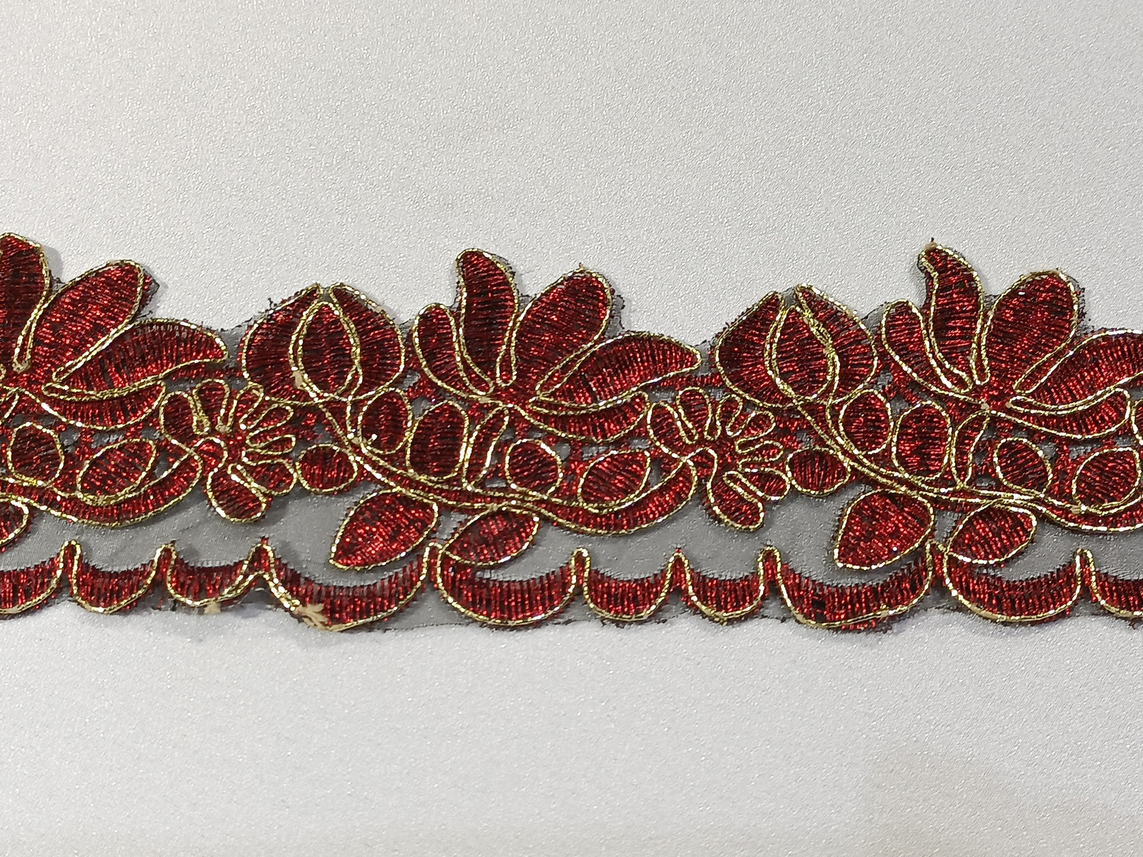 Cenefa bordada con diseño floral en color rojo granate canteado y perfilado con cordón en oro con un bordado de gran calidad.Es un tipo de artículo llamativo de muy buen acabado para tejidos de ceremonia, complementos de prendas y toques llamativos.