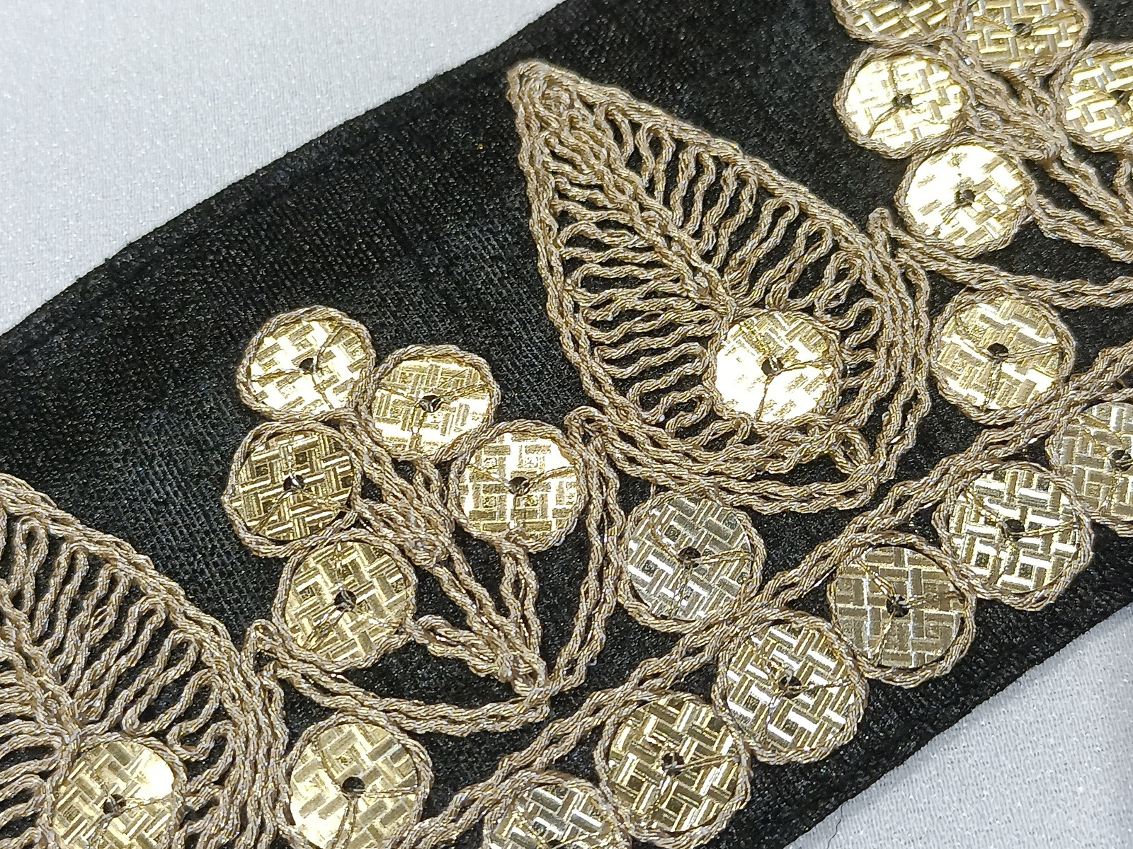 - Cenefa bordada en fondo verde de chantú(seda salvaje en poliester)con cordoncillo en oro haciendo composición en picos con lentejuela en oro mate con bordado en relieve.Es un tipo de artículo llamativo de muy buen acabado para tejidos de ceremonia, complementos de prendas y toques llamativos.