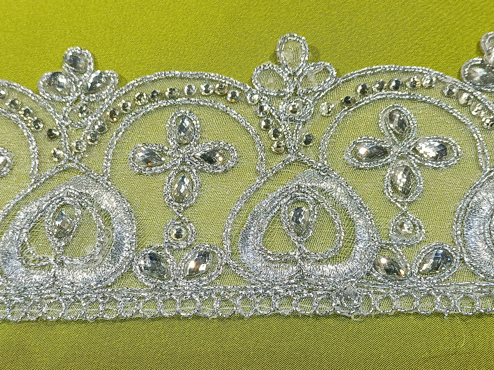Cenefa bordada sobre organza de cristal en plataefecto metálico canteado en cordoncillo en el mismo tono de color con detalles de diseño en flores con forma de cruces y piedras en tonos plata . Artículo para rematar cantos de trajes de fiestas , reinas de fiestas, carnavales,Moros y Cristianos...y en general vestuarios de tipo festivo.