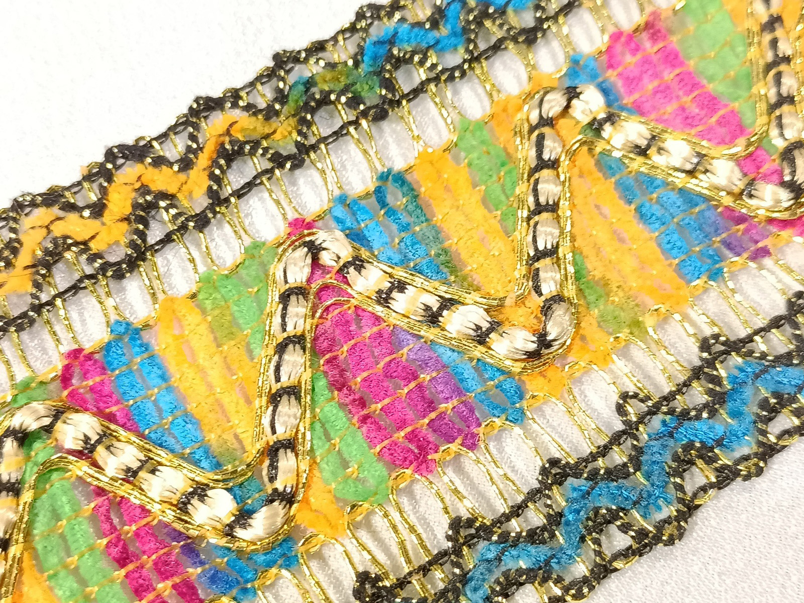 Cenefa Multicolor en hilo con diseño en zig-zag por la zona central y cantos en los dos extremos rectos con una pequeña onda. Artículo utlizado para carnavales y eventos festivos en decoración de prendas de vestir.