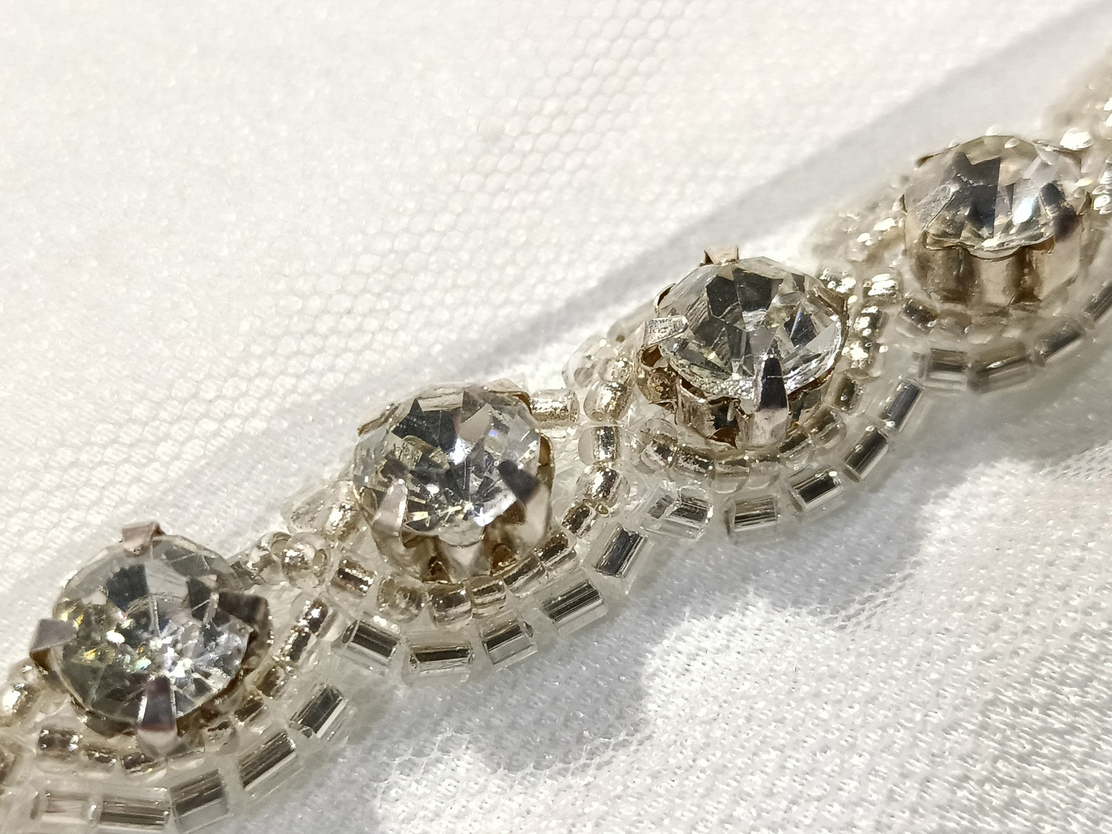 Tira de cristal de tamaño grande engarzado en corte tipo diamante sobre tul blanco para recortar.Artículo de una calidad excelente utilizado para vestidos de ceremonia,graduaciones y en general confecciones de fiesta.