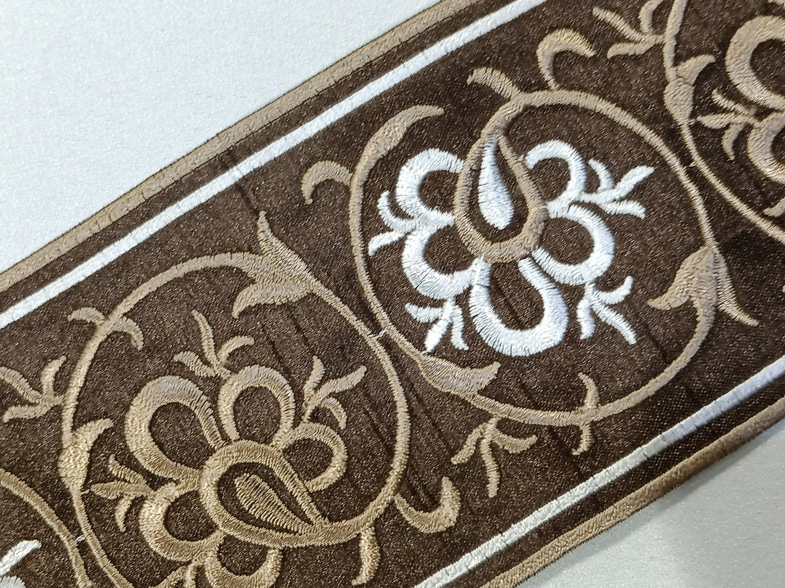 - Cenefa bordada en acabado de cinta con bordado de enredadera tipo flor en blanco y marrón claro sobre fondo marrón chocolate y canteado bordado en ambos extremos en blanco y marrón claro. Es un articulo bordado de gran calidad sobre tejido de Shantug en poliester.