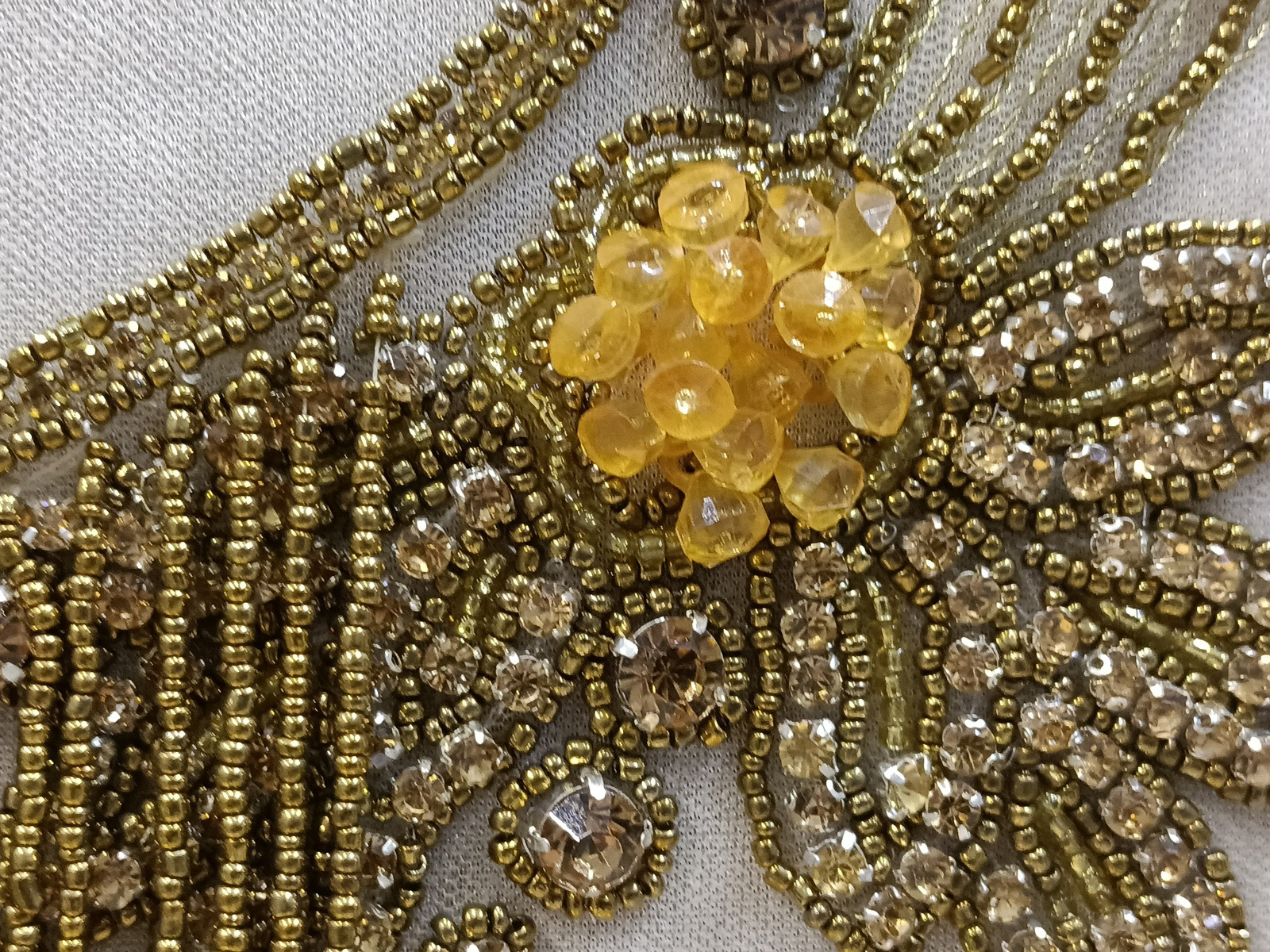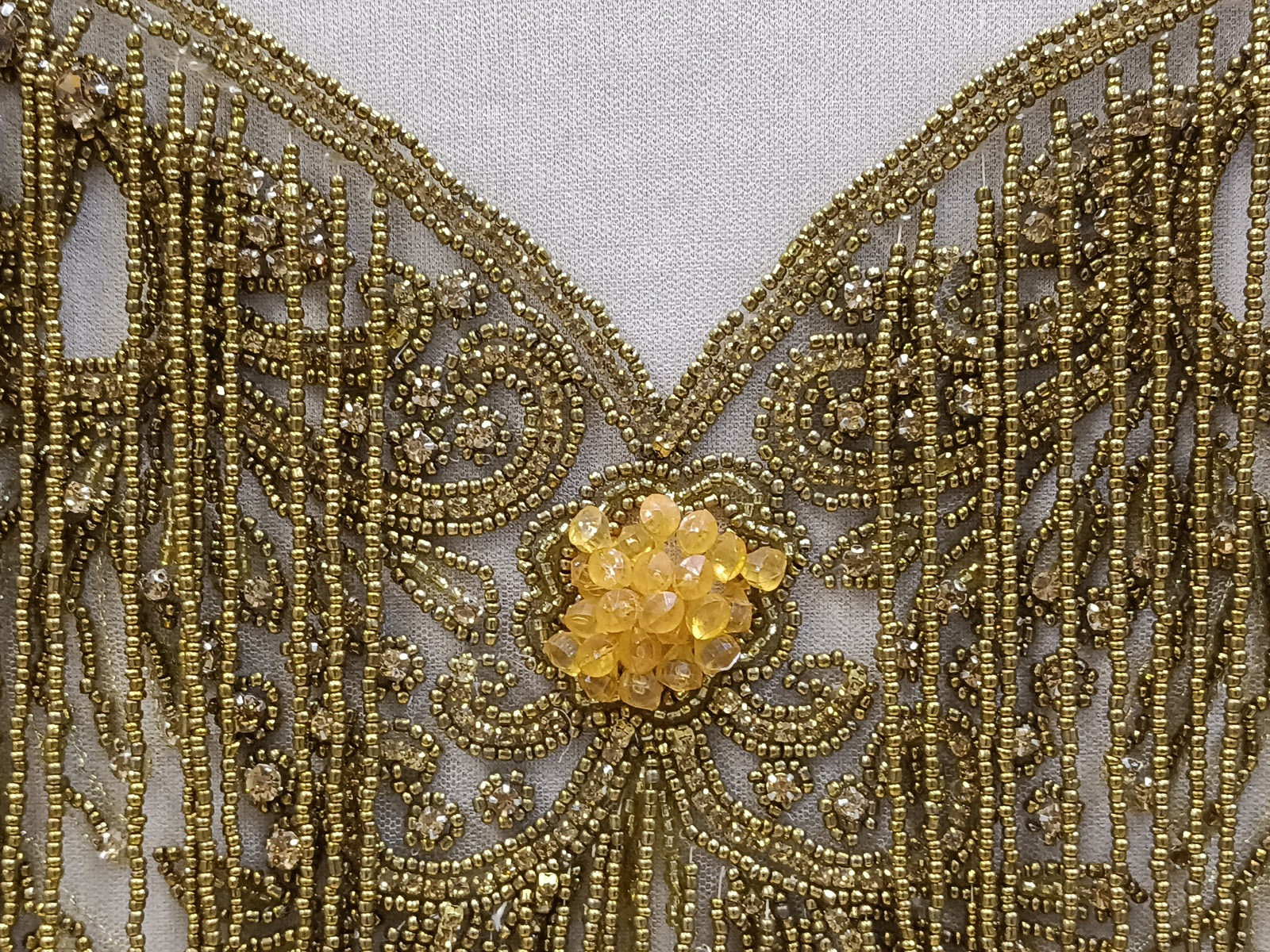 Cuerpo de una calidad excelente bordado en hilo de oro envejecido sobre tul canteado con rocalla y cristal combinado con fleco de rocalla por todo el cuerpo con una extensión más larga por la parte central. Modelo para lo confección de cuerpos de ceremonia y actos de fiesta.