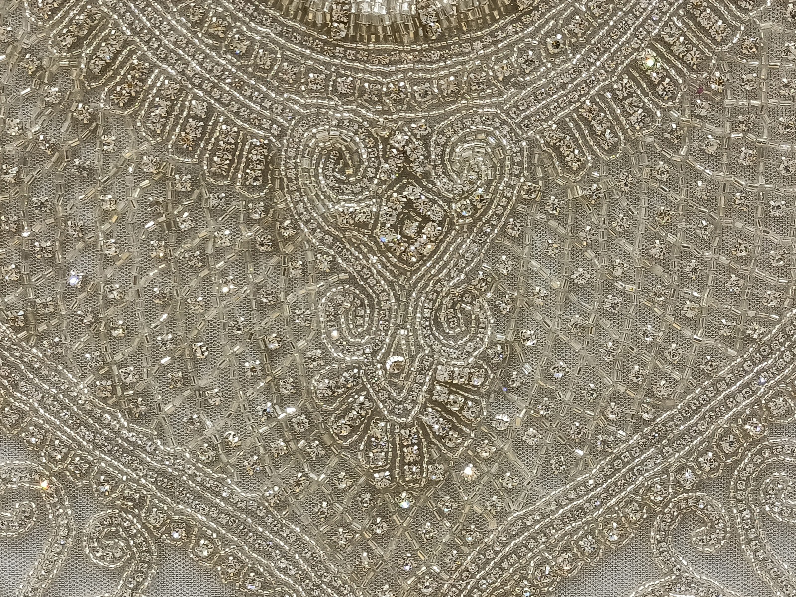 Cuerpo de pedrería completamente bordado en cristal en diferentes tamaños sobre tul blanco con diseño expectacular de cuello redondo simulando un collar y parte central con bordado tipo floral terminado en onda en pico con cenefa de cristal por la parte inferior.Es un modelo orientado a ceremonia y confeccion de trajes de novia.