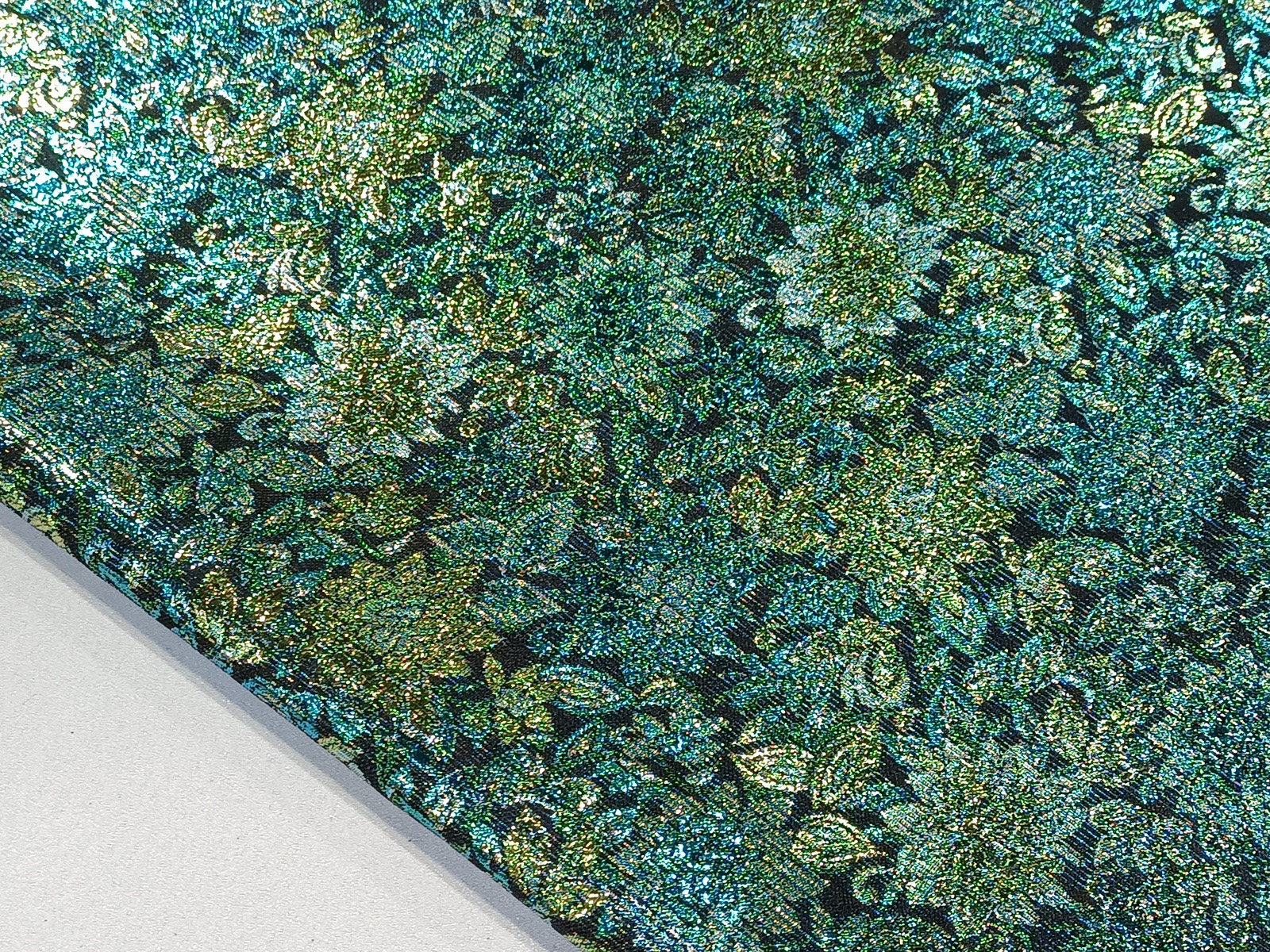 Tejido de fantasía en lame poliester en efecto metálico con diseño en flores en combinación en azul y verde.. Tejido muy llamativo para la elaboración de trajes de fiestas , carnavales, reinados,etc..