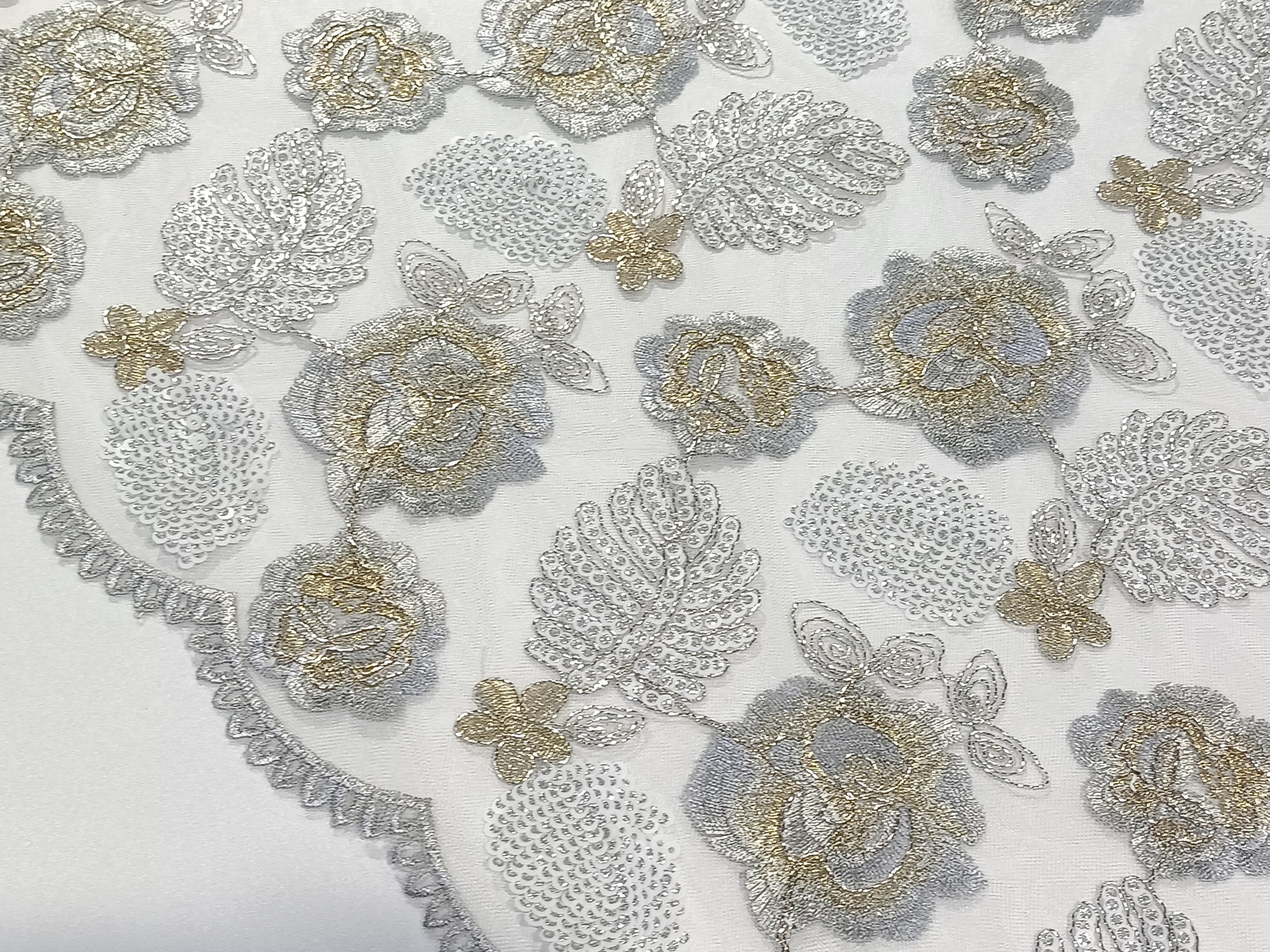Tejido de tul bordado con diseño en hojas en forma de cascada alternando bordado y lentejuela. Tejido preparado para confección de vestidos , el bordado va en cascada, contiene mas cantidad de bordado de un tejido por uno de los extremos más que en otro.