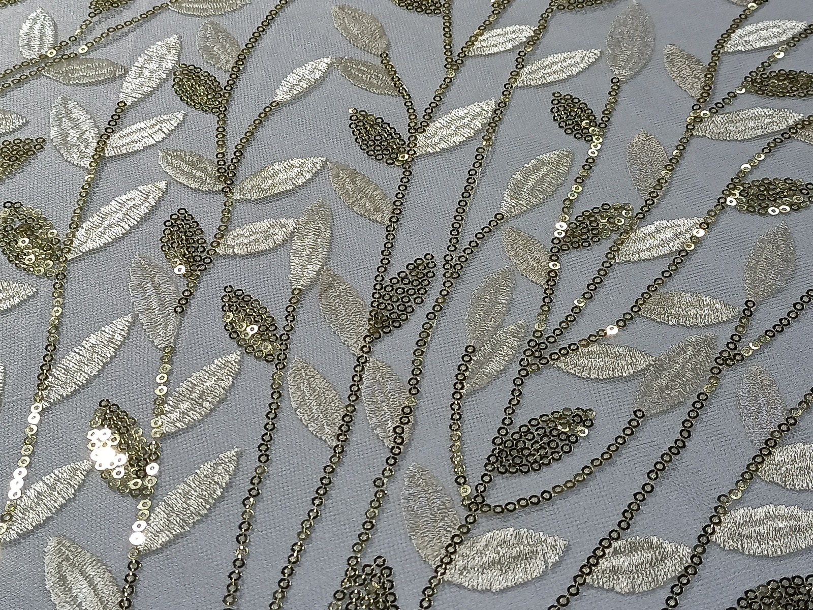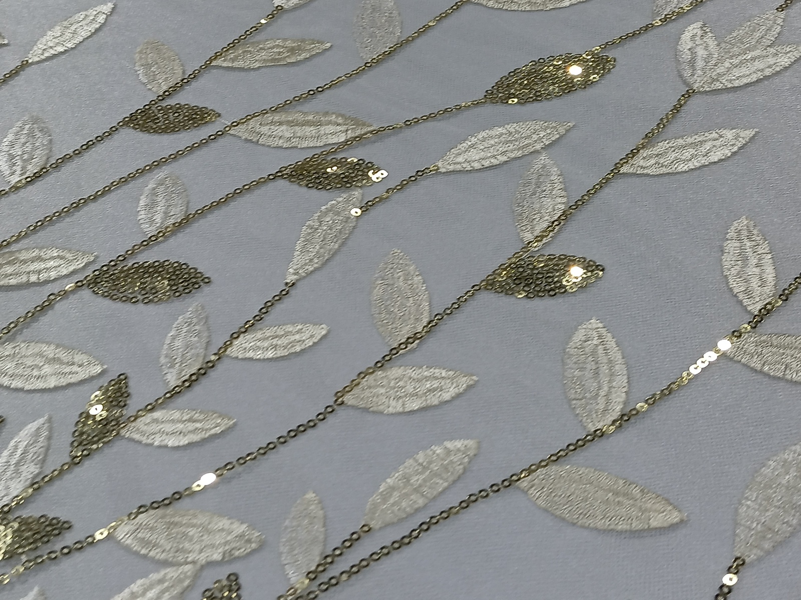 Tejido de tul bordado con diseño en hojas en forma de cascada alternando bordado y lentejuela. Tejido preparado para confección de vestidos , el bordado va en cascada, contiene mas cantidad de bordado de un tejido por uno de los extremos más que en otro.