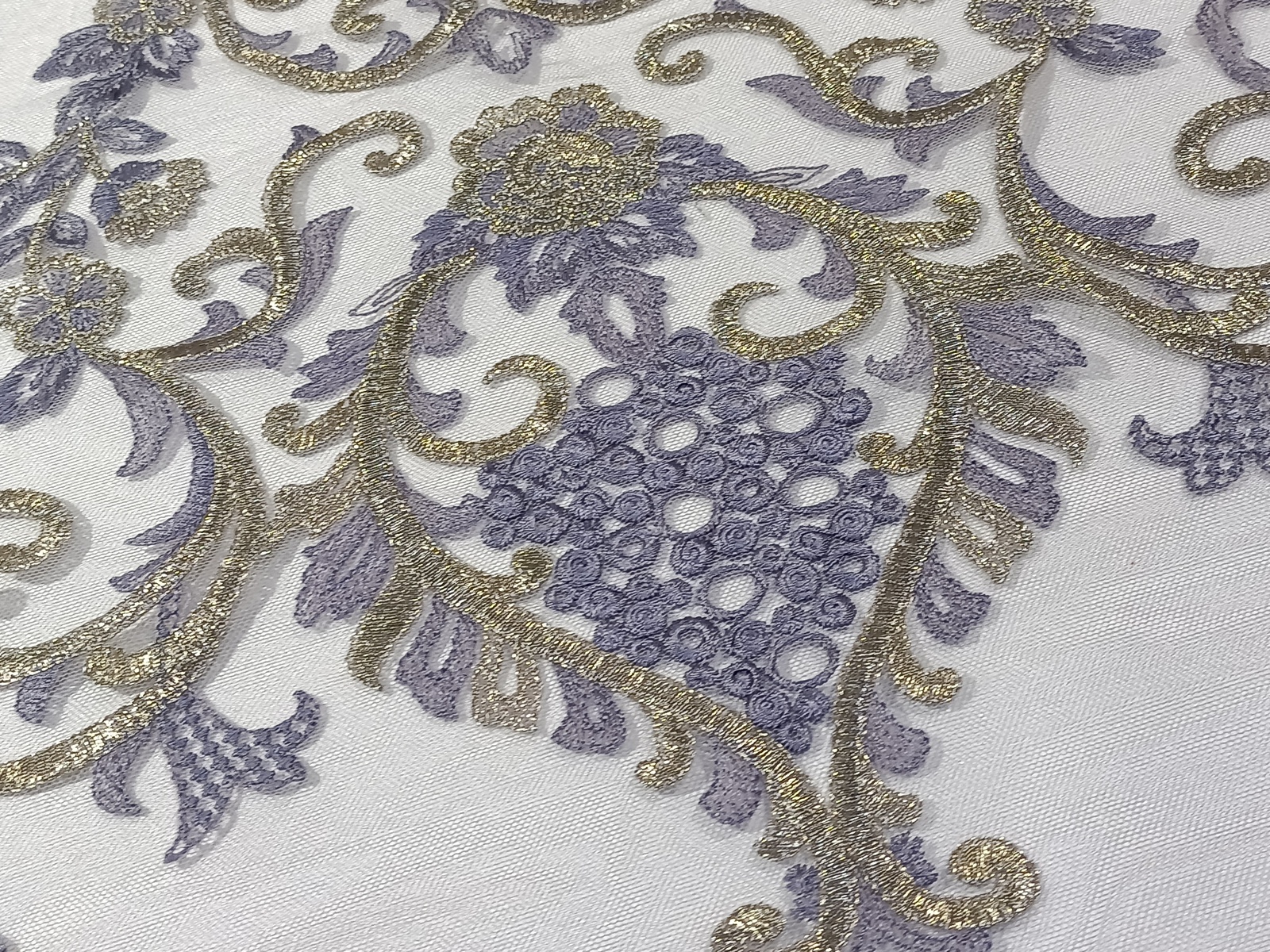 Encaje de una excelente calidad en tul sedoso de tonalidad en malva con bordado de diseños geométricos de tipo medallón combinado con lurex en oro con una cenefa en ambos extremos en ondas en el mismo tono de color.