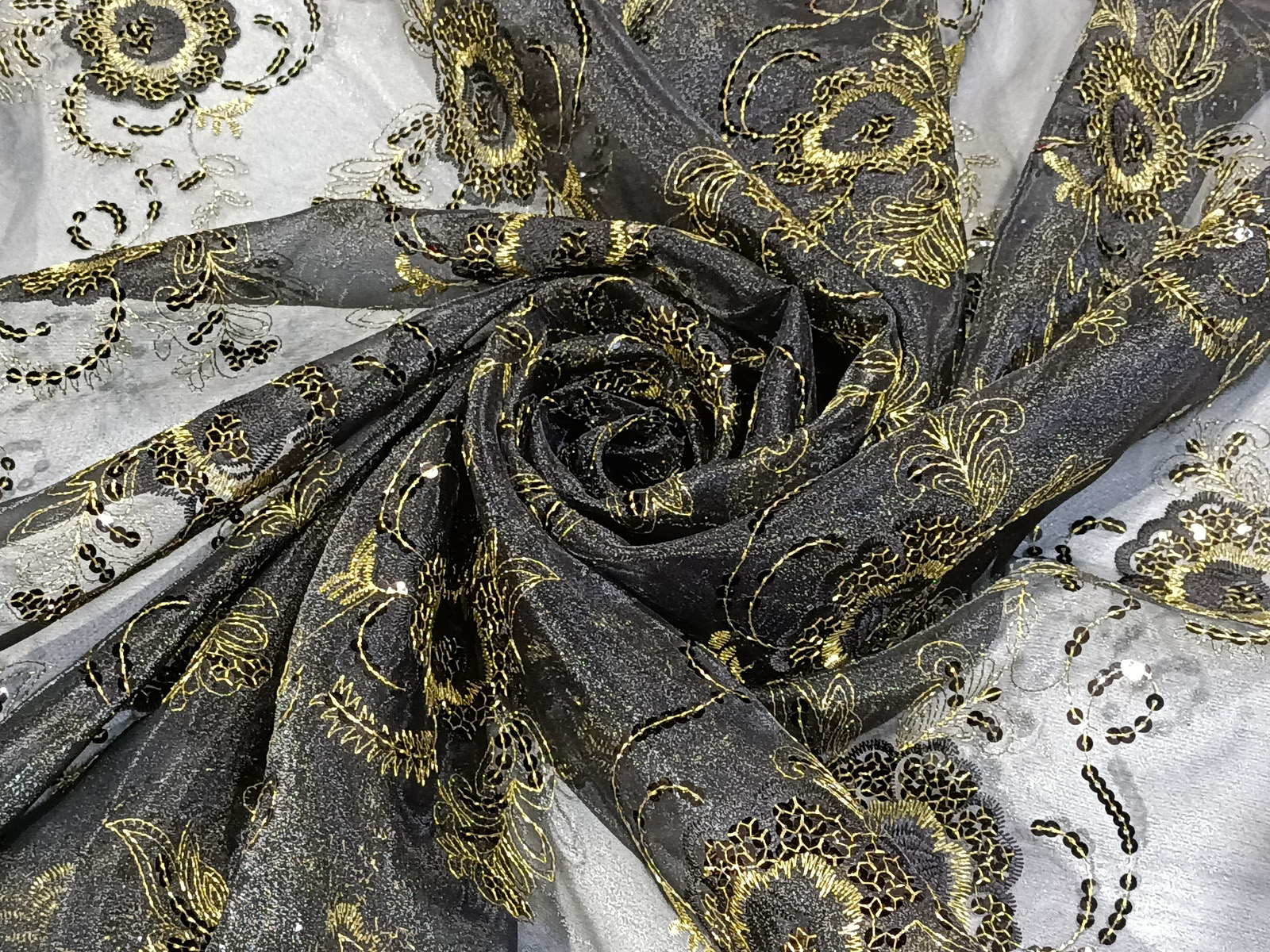 Tejido de organza de cristal con cenefa bordada en blonda en uno de sus extremos,flor bordada con detalles de lentejuela en negro y filamentos bordados en hilo metálico.