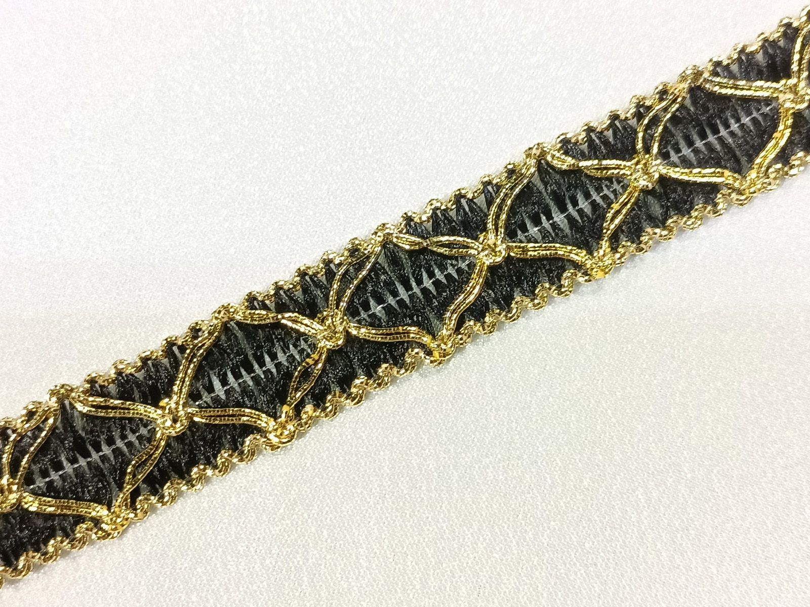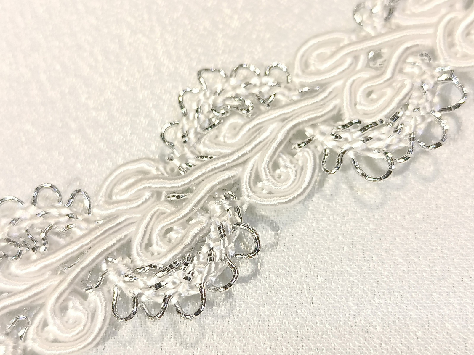 Pasamanería trenzada en rayón haciendo ondas con canto metálico de gran vistosidad con diseño central de gran calidad mezclando colores blanco y plata metálico. Artículo muy utilizado para liturgia ,Semana Santa y confección,