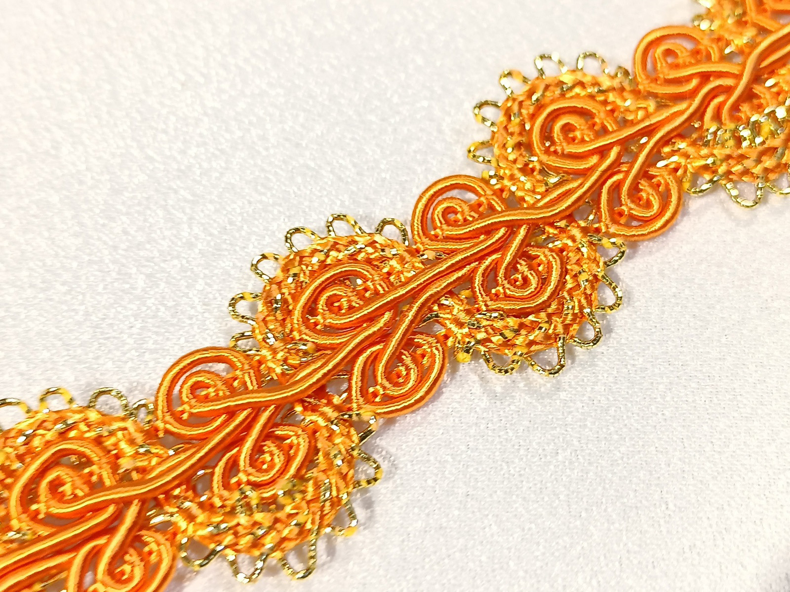 Pasamanería trenzada en rayón haciendo ondas con canto metálico de gran vistosidad con diseño central de gran calidad mezclando colores naranja y oro metálico. Artículo muy utilizado para liturgia ,Semana Santa y confección,