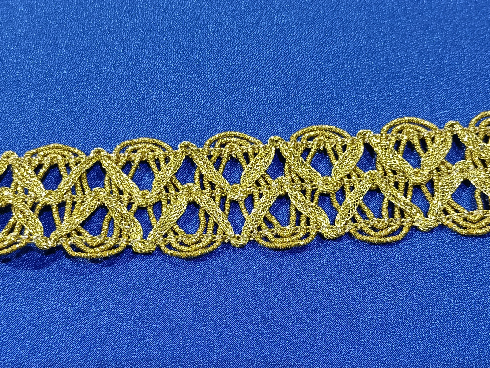 Pasamanería trenzada en hilo oro efecto metálico de textura blanda y moldeable con diseño ondulado trenzado abierto.