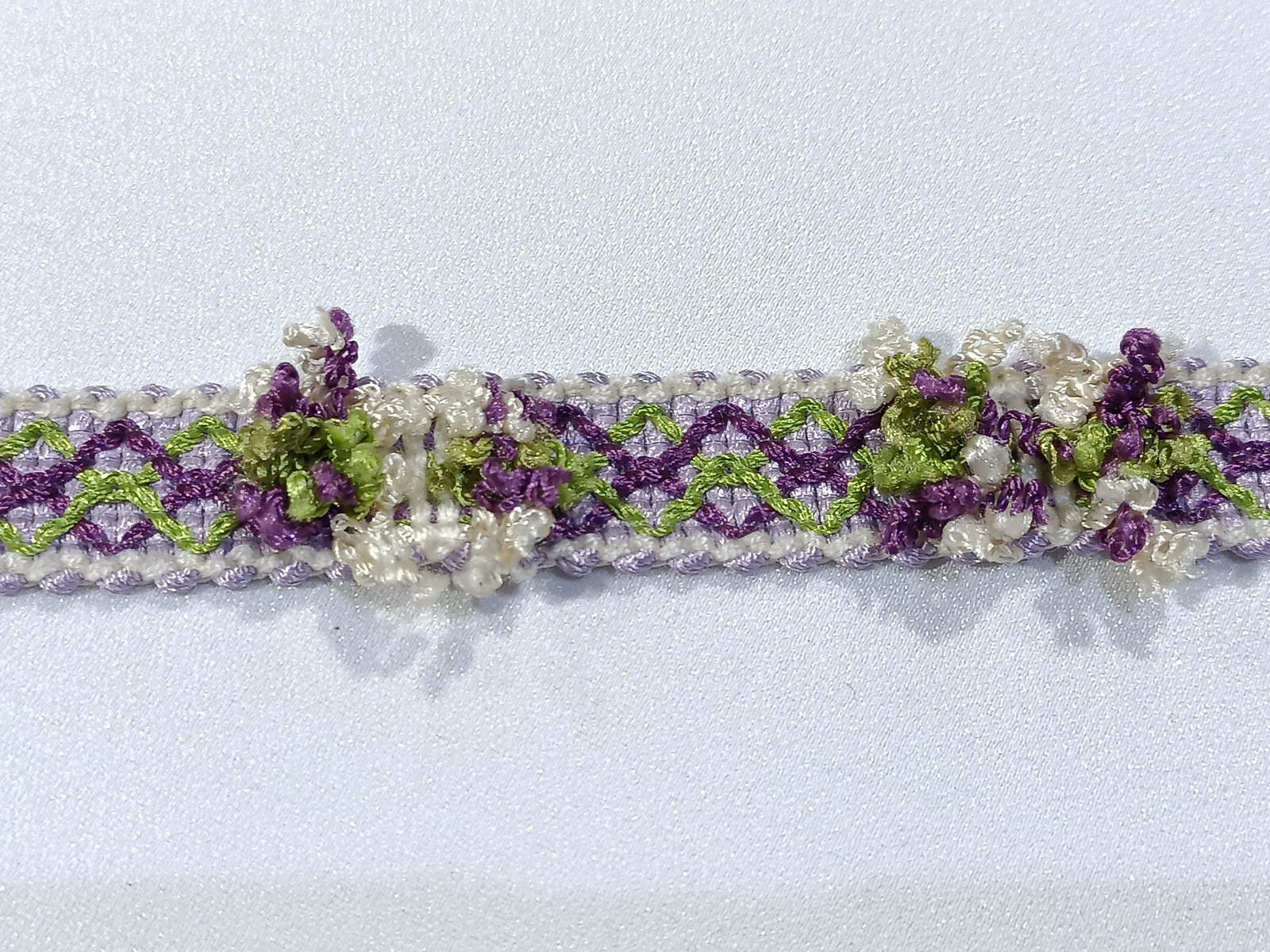 Pasamanería rustica de confección con terminaciones en la superficie de hilatura de gran diseño para prendas de vestir.