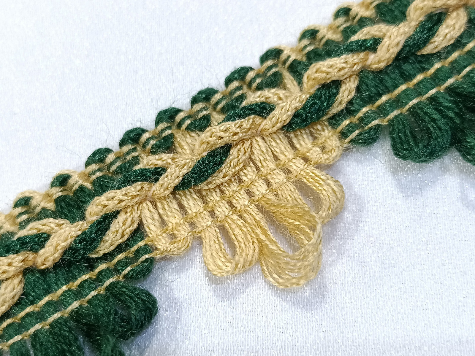 Pasamanería Picos trenzado en acabado rustico de gran colorido y tacto para cualquier prenda de vestir.