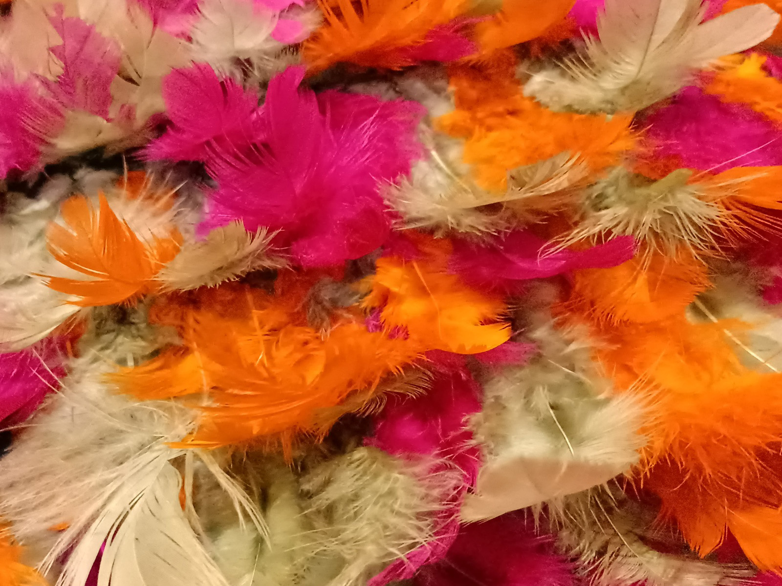 Tejido de tul con pluma cosida en su totalidad en combinación de colores donde predominan el fucxia y naranja. Contiene pluma por todo el tejido en un ancho de 125 cms. Tejido muy llamativo y de una calidad de plumaje excelente.