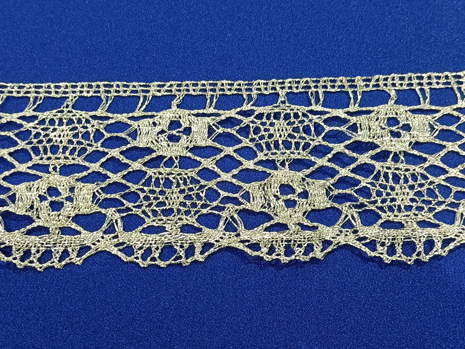 Puntilla con intervalo de diseño en flor con acabado en ondas en color plata metálico.Articulo muy usado para terminaciones de trajes de falleras, imágenes de culto,Semana santa y eventos liturgicos.