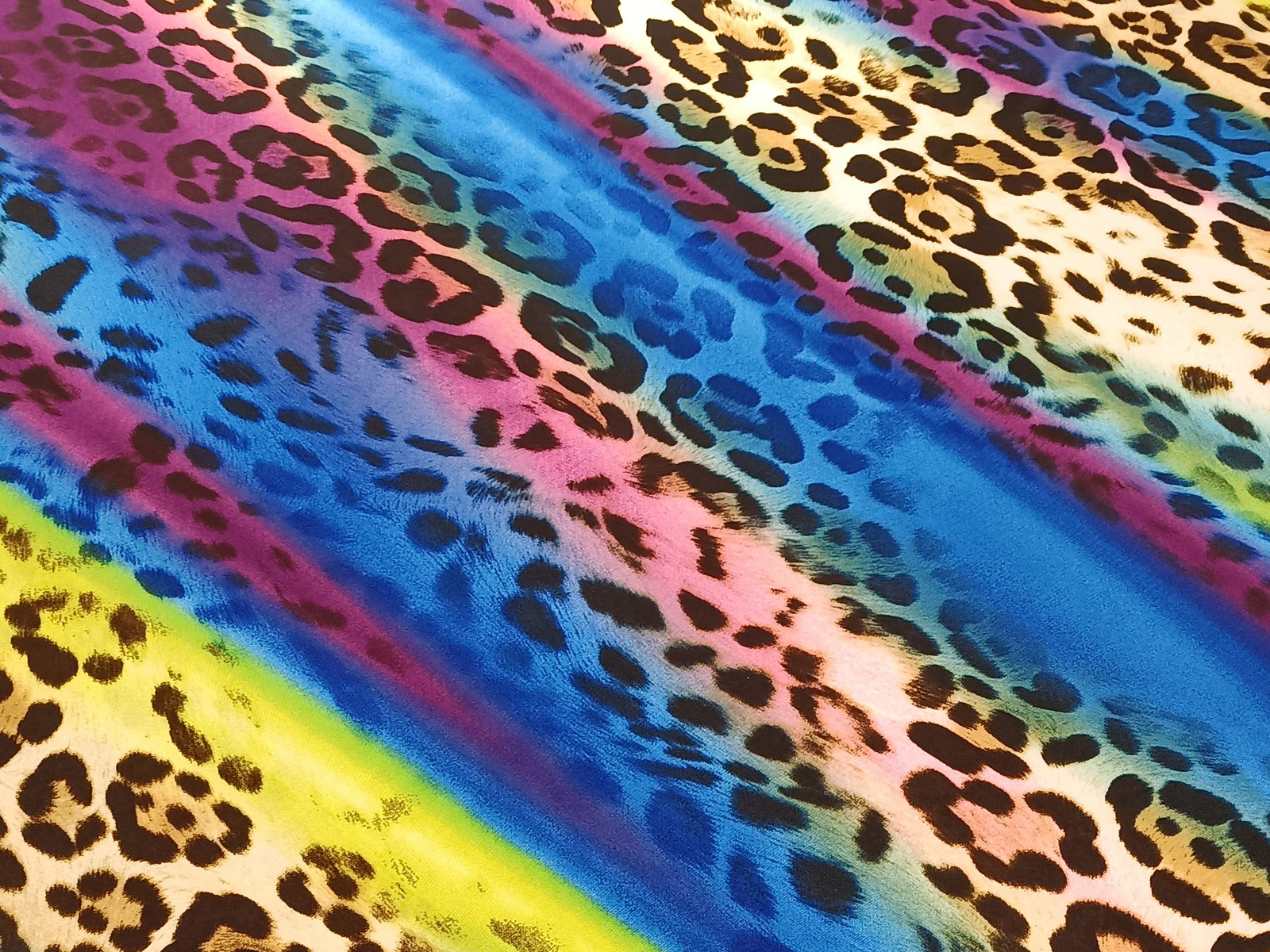 Tejido de punto de lycra en textura muy suave y fino con estampación de guepardo multicolor en colores muy vivos con elástico en horizontal. Tejido muy apropiado para la confección de bodys, gimnasia ritmica, carnavales...y en general vestimentas divertidas y flexibles.