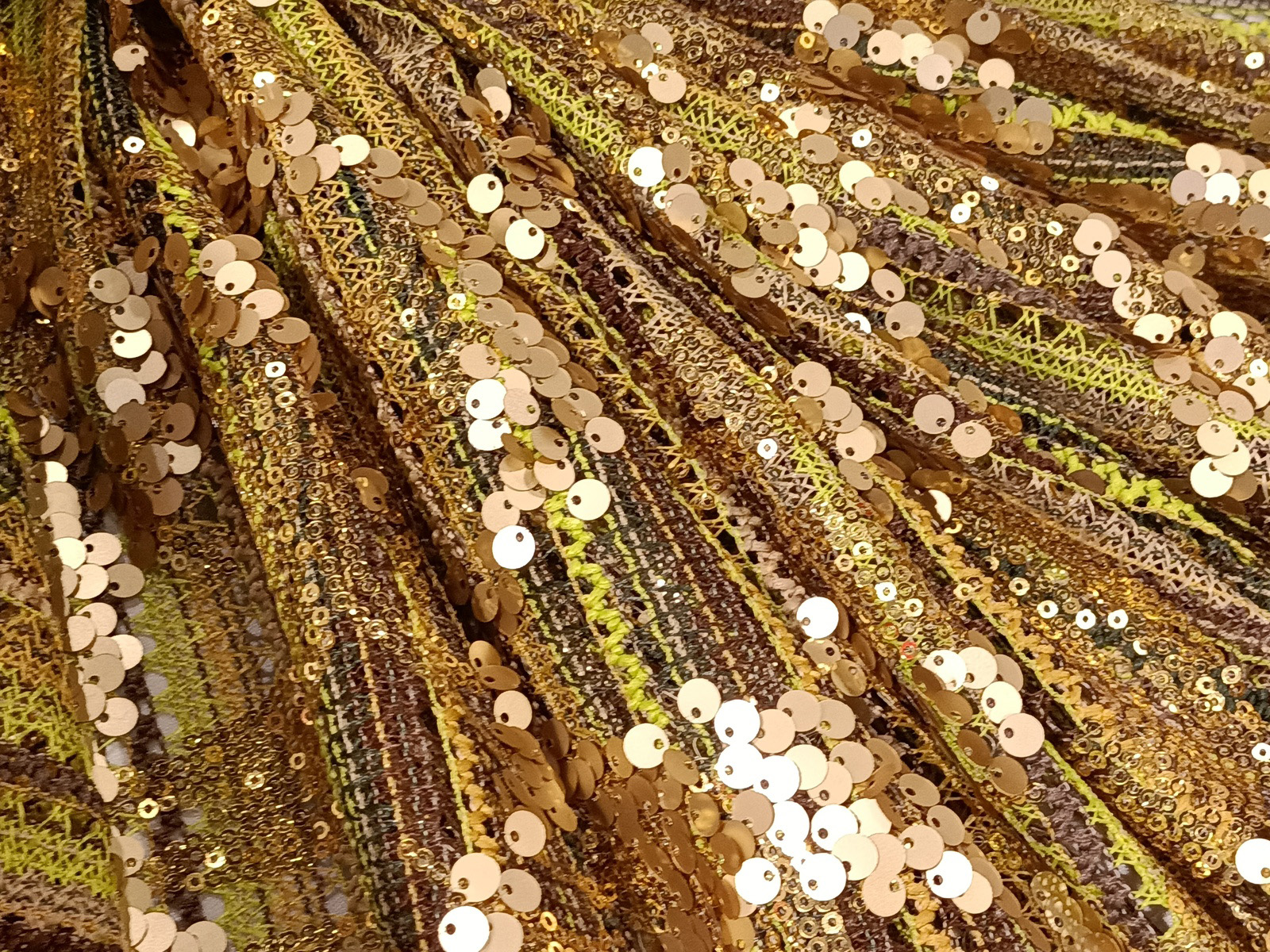- Tejido rustico de hilo en varias tonalidades bordado en lentejuela pequeña en brillo en tono oro y grande en oro en mate.