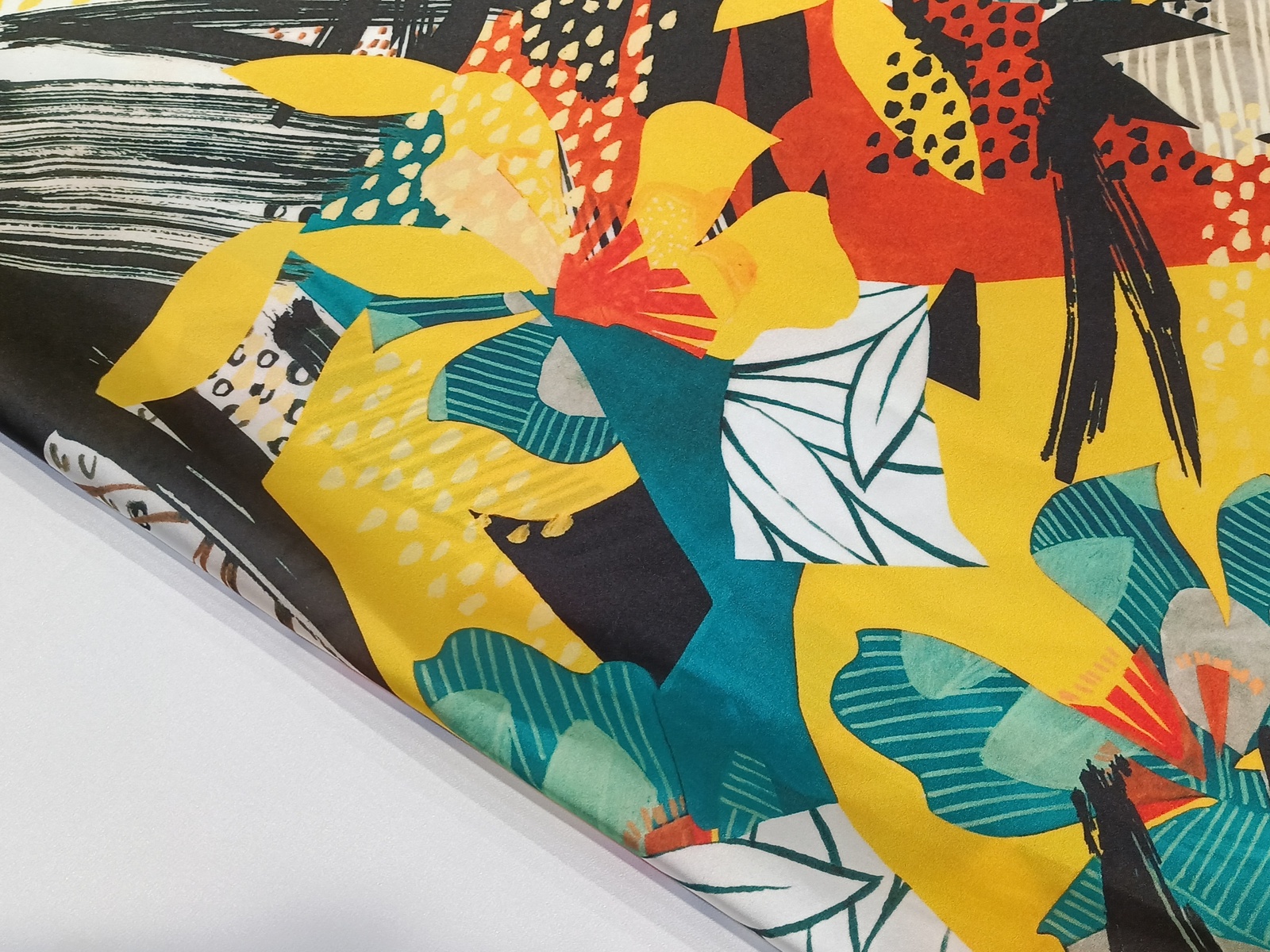 Saten en piel de angel o seda japonesa en un acabado muy suave por la superficie del tejido en textura fina y muy agradable en color de fondo amarillo con contrastes en negros , alternando con flores en distintos colores. Es un tipo de tejido perfecto para la confección de prendas muy fluidas y blandas.