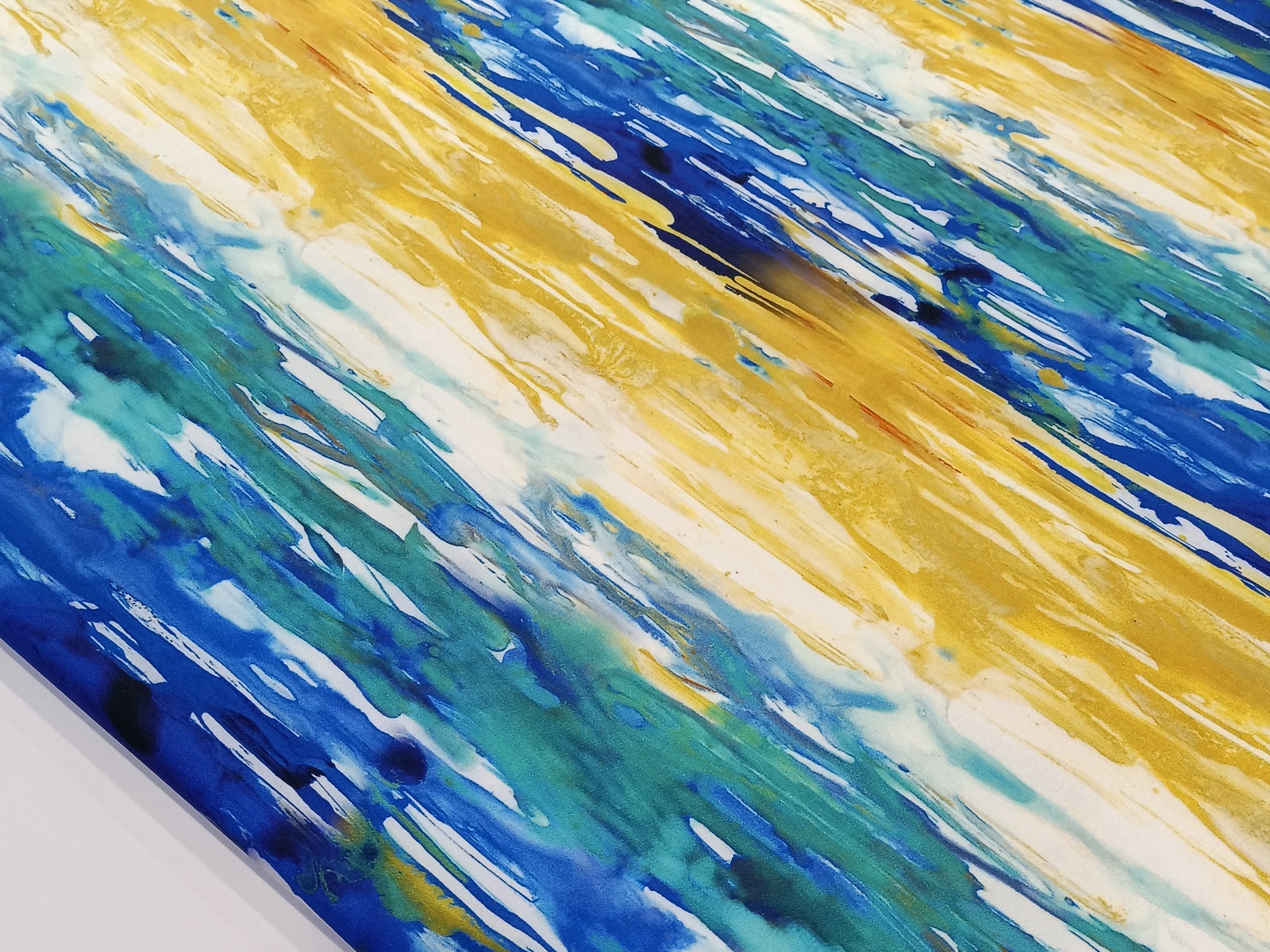 Saten elástico en acabado mate con diseño en impresión rayado en horizontal con un efecto realizado a pinceladas en combinación de colores amarillos, azules y blancos .