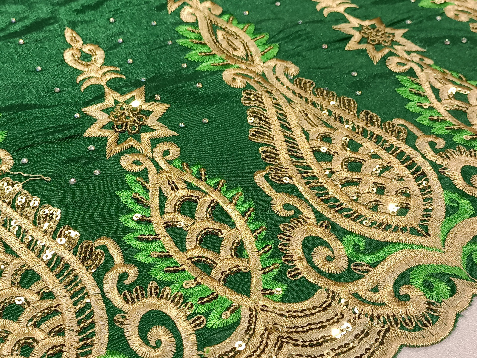 Tejido de Shantung bordado de fondo verde con cenefa bordada en uno de sus extremos en hilo color verde y oro con detalles de bordados etnicos en el resto del tejido,incluye piedras en efecto cristal por todo el tejido.