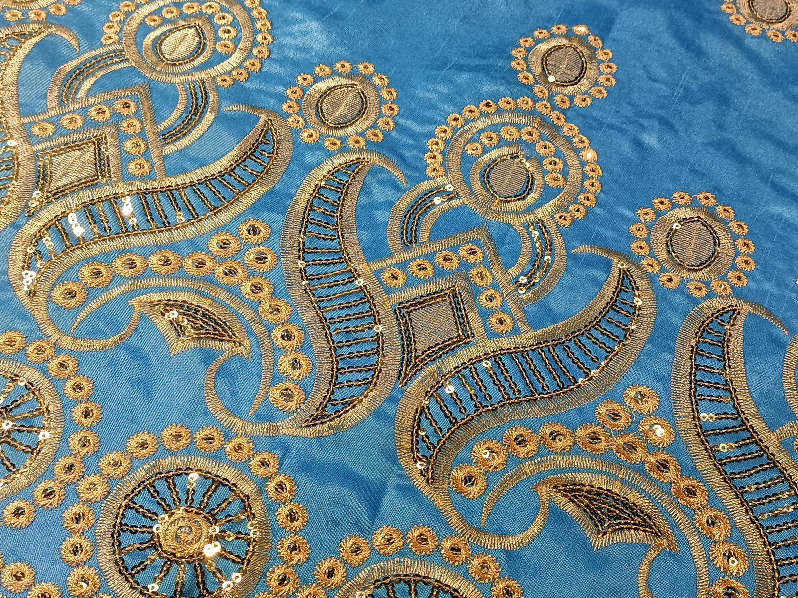 Tejido de Shantung azul con gran ccenefa bordada en uno de sus extremos formando circulos y espirales en subidas con centros de bordados,expectacular tejido tanto en calidad com en composición de diseño.Por el otro extremo del tejido bordado en canto de ondas y diseño de ovalos bordados por el centro.