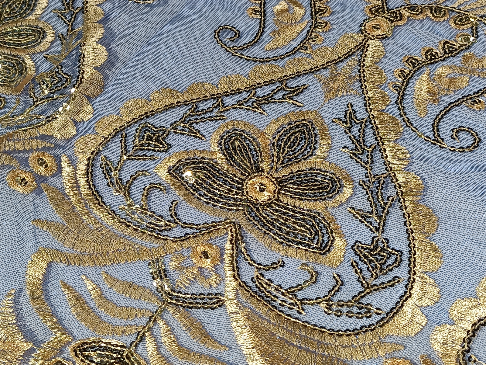 Tul de fantasía bordado en hilo oro con tonalidades en azul klein con una gran cenefa bordada en uno de los extremos de tipo arabesco y detalles bordados por todo el tejido.Tejido muy apropiado para eventos de fiestas como teatros,carnavales o fiestas de Moros y Cristianos.