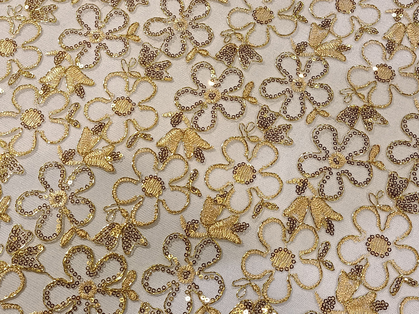 Tejido de tul invisible con margaritas bordadas en oro con canto en relieve en oro metálico y lentejuela.Tejido muy utilizado para eventos festivos, disfraces, capas de Reinas de fiestas..etc.