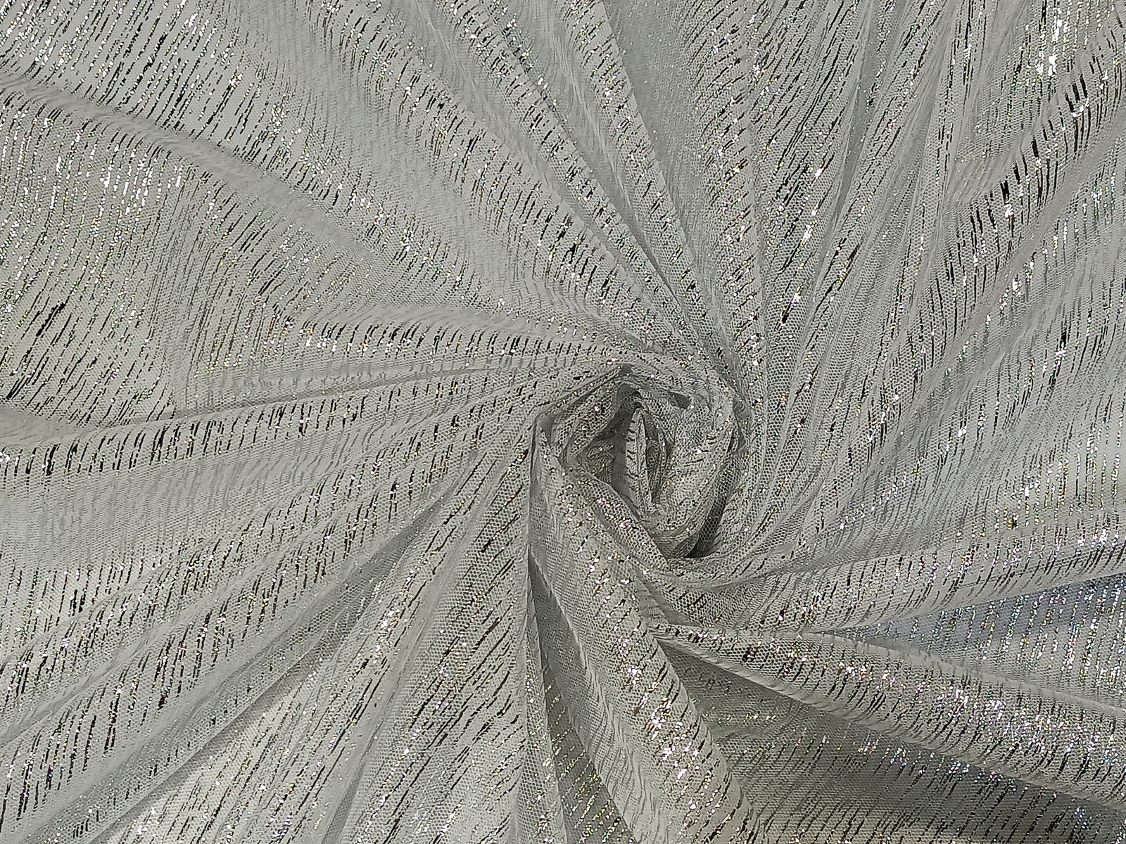 Tejido de tul semirigido en tono blanco con laminado en rayado fino en color plata brillo con buena textura.Tejido muy llamativo y de facil corte para prendas de fantasía.Tejido muy utilizado para eventos festivos, disfraces, capas de Reinas de fiestas..etc.